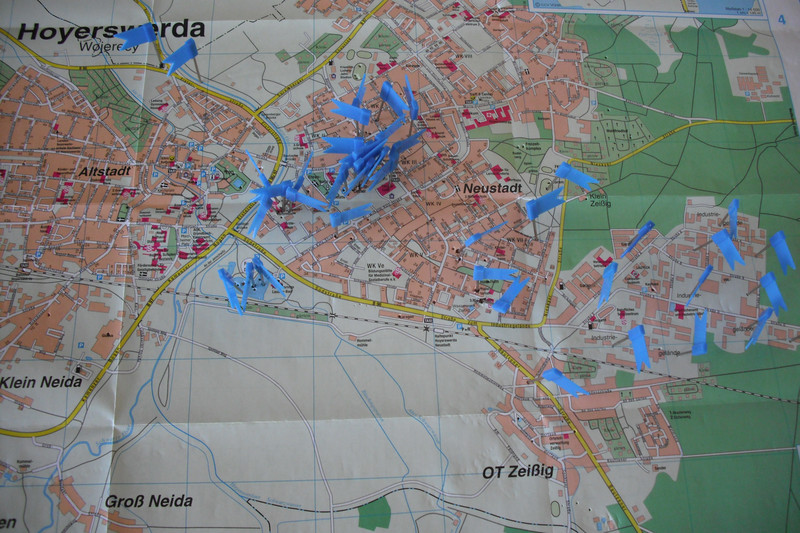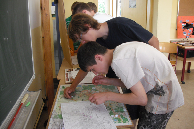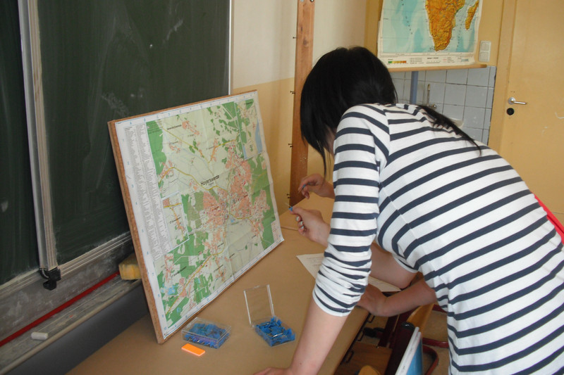 Mit Hilfe der Nadelmethode werden auf der Landkarte von Hoyerswerda und Deutschland " Wanderkarten" erstellt. Die Schüler nutzten den Stadtplan von Hoyerswerda für Markierungen ihrer täglichen Wanderungen, Lieblingsorte, Orte von besonderem Interesse. Auf der Deutschlandkarte haben die Schüler Orte markiert, in die Freunde, Bekannte und Familie gezogen sind. Teilgenommen haben die Schüler der 8ten Klassen. Das Projekt wurde vom Internationalen Bund an unserer Schule am 9ten und 10ten Juni durchgeführt.