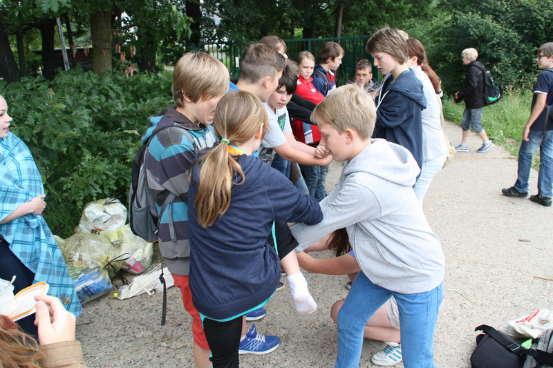 Alle Klassen trafen sich nach einem Zeitplan auf dem Schulhof, um sich selbstständig auf den Weg zu begeben. Dabei halfen ihnen ein Plan und eine Karte. Unterwegs galt es an 10 Stationen verschiedene Aufgaben zu lösen. Dort mussten die Klassen mal im Team, mal durch ausgewählte Vertreter, ihr Wissen unter Beweis stellen, sportliche Höchstleistungen bringen oder einfach zeigen, dass sie gemeinsam etwas erreichen können.