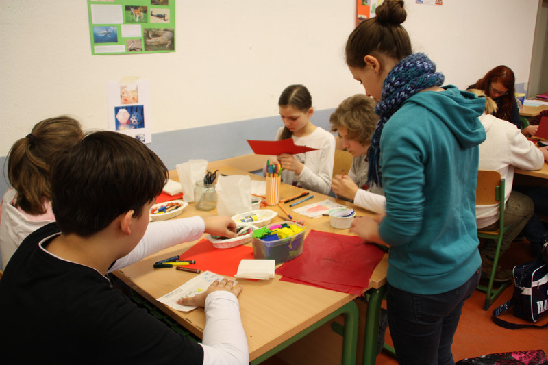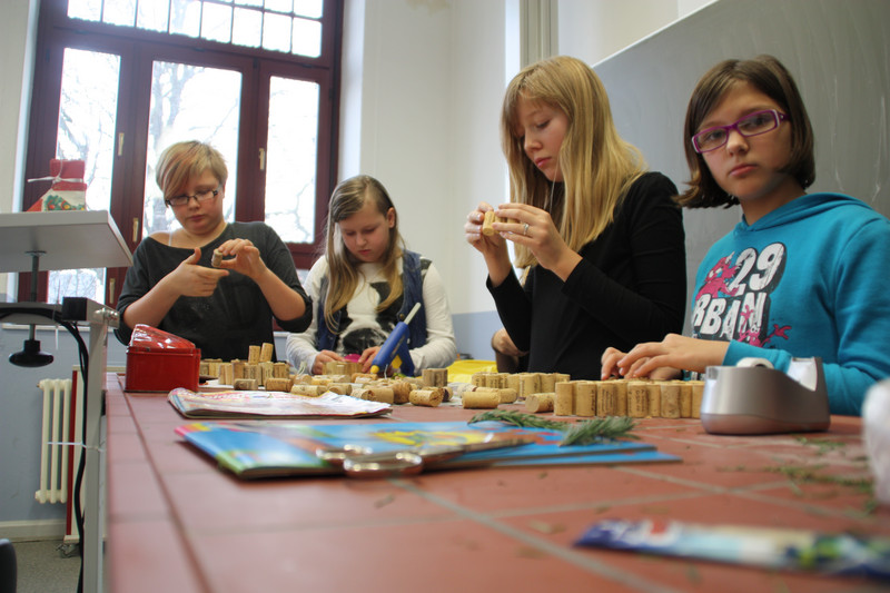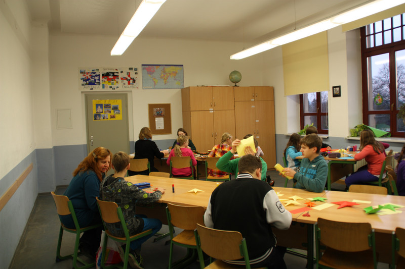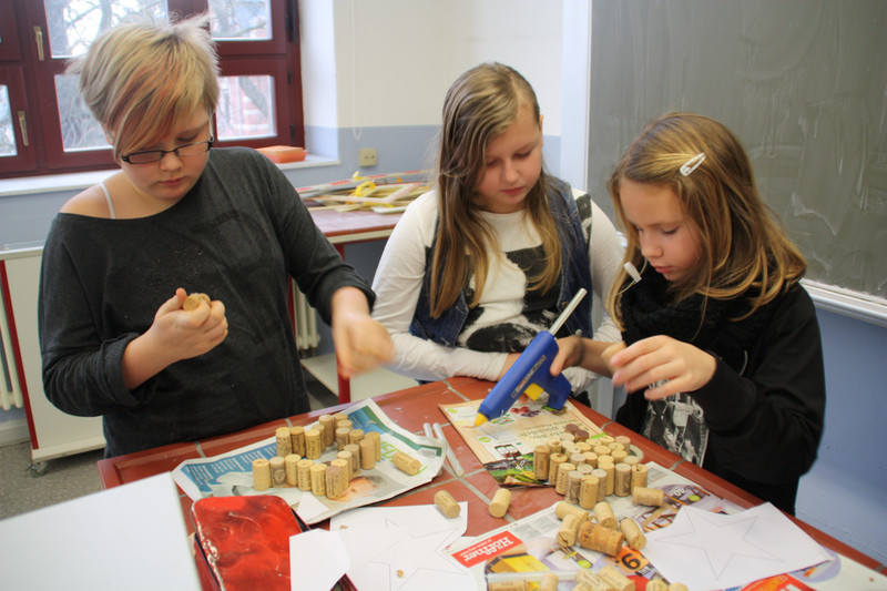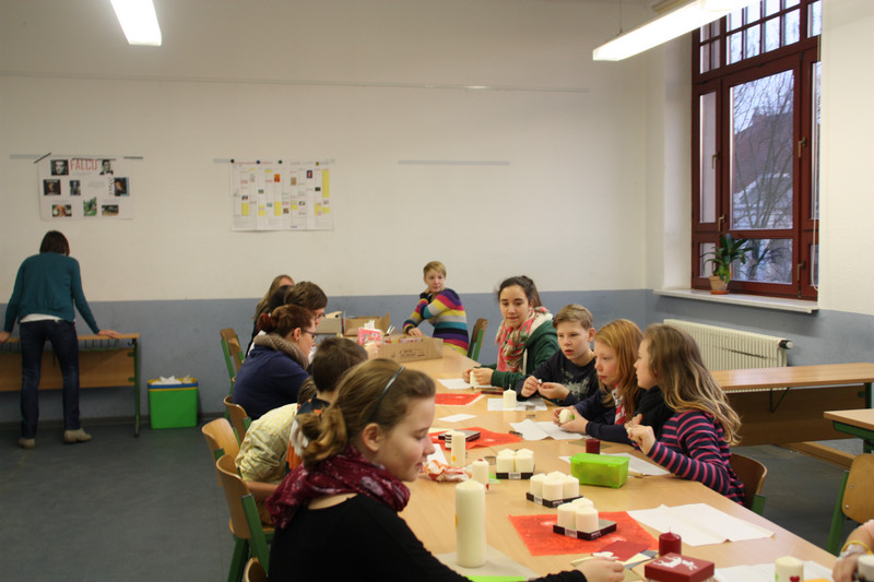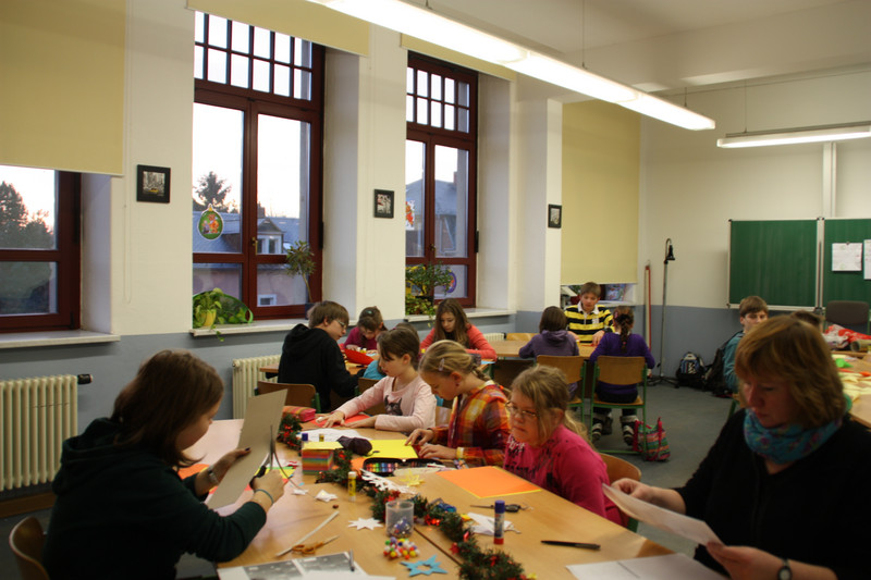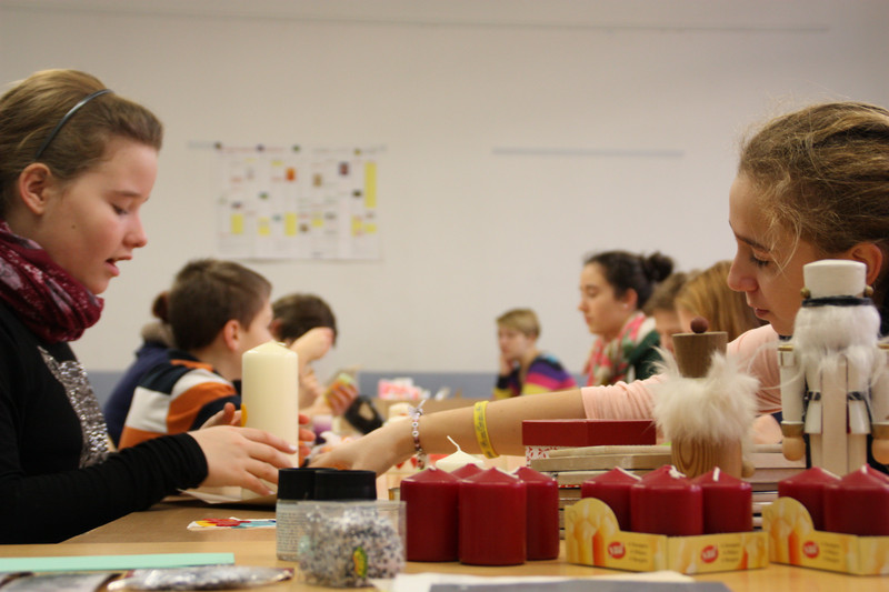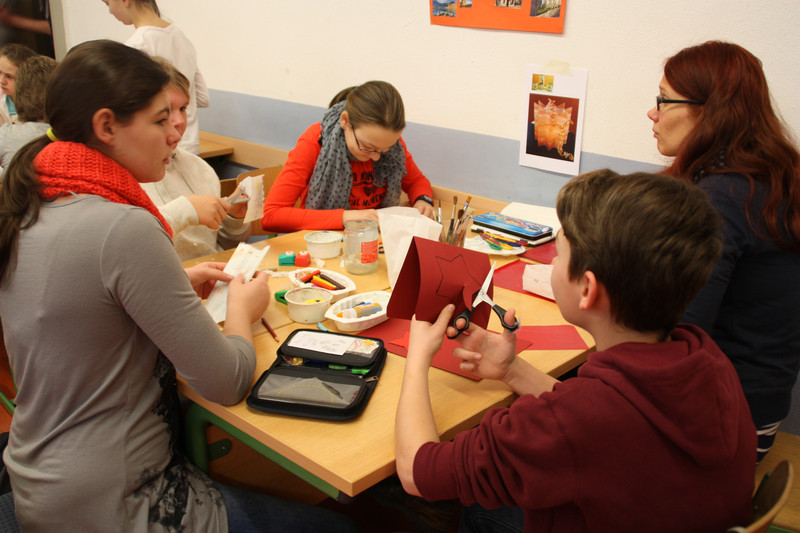 Am Donnerstag, 19.12.2013, fand für alle Schülerinnen und Schüler ein gemeinsames Weihnachtsbasteln statt. So gab es zum Beispiel Stationen für 3D-Karten, Salzteig, Kerzen gestalten, Faltsterne oder Geschichten vorlesen. Die Schüler der Klassen 9 und 10 betreuten die verschiedenen Stationen.