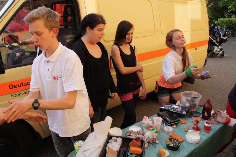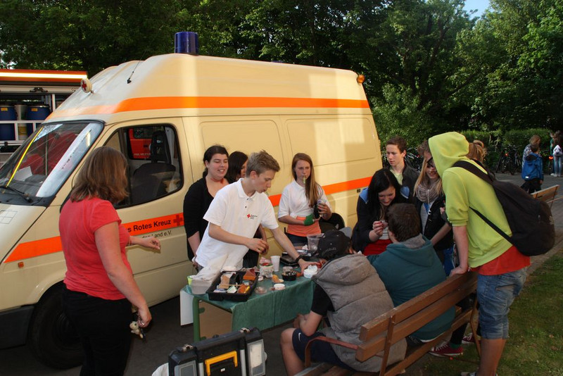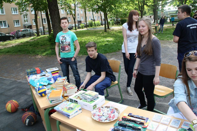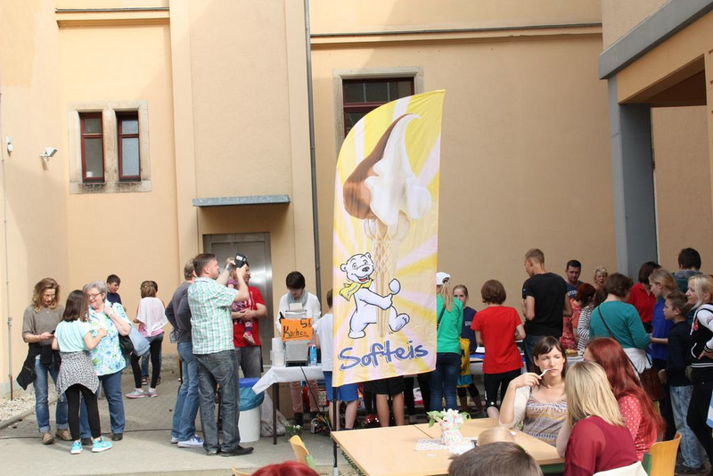 Auf Hof A waren eine Obst- und Saftbar, Kaffee und Kuchen, sowie ein Süßigkeitenstand vorbereitet. Außerdem konnte die Feuerwehr Radebeul mit 2 Löschzügen und ein Fahrzeug des DRK besichtigt werden.