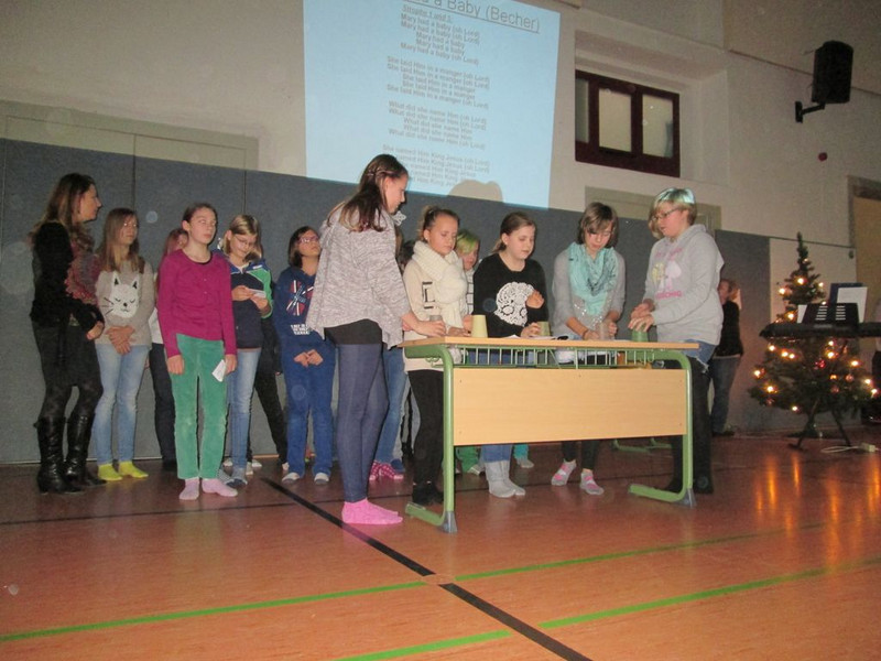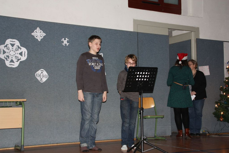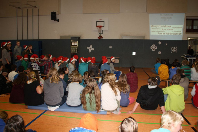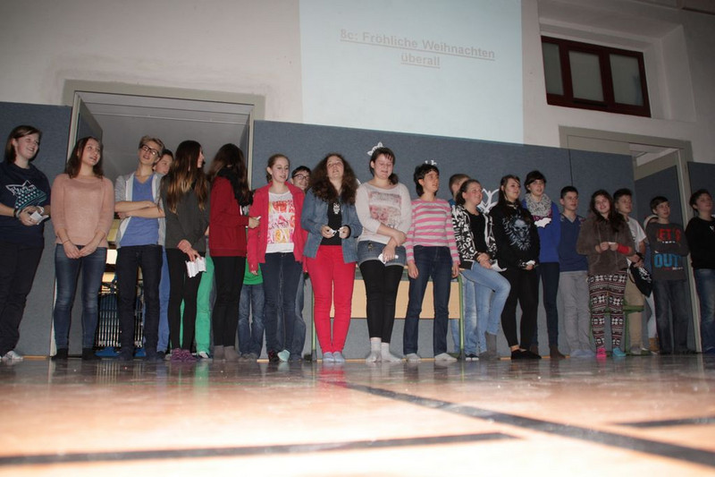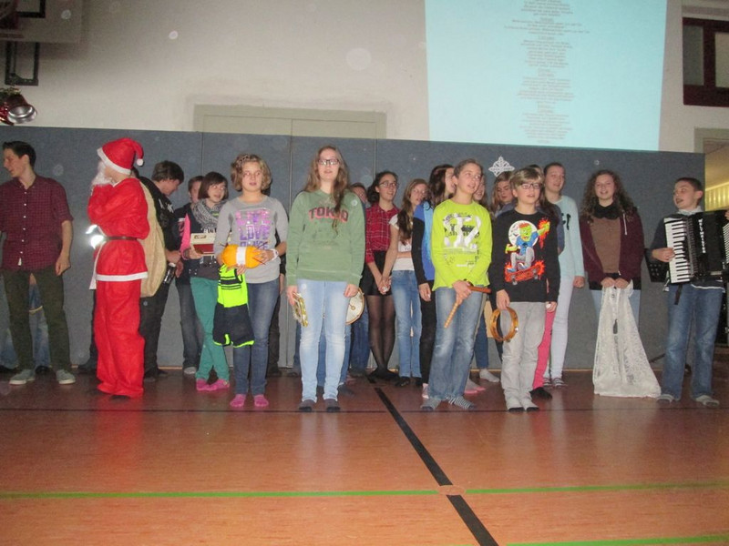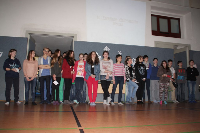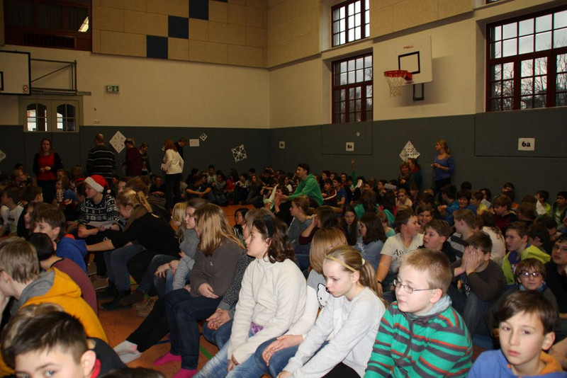 Bevor die Schüler und Lehrer in die verdienten Weihnachtsferien starten konnten, gab es in der Turnhalle wieder ein gemeinsames, 90-minütiges Weihnachtsprogramm. Jede Klasse hatte ein Weihnachtslied, Gedicht oder Instrumentalstück vorbereitet. Und auch die Lehrer hatten ein Weihnachtslied eingeübt.