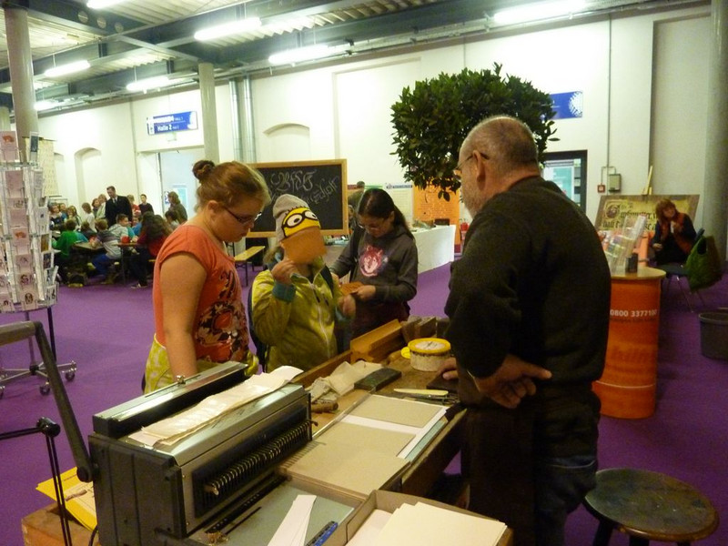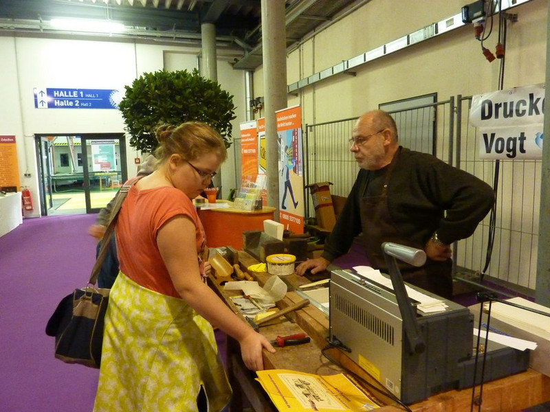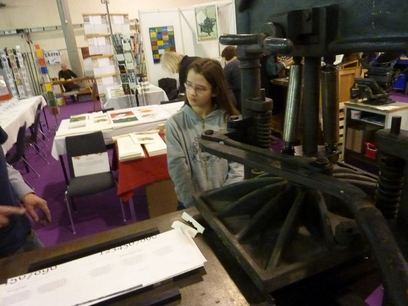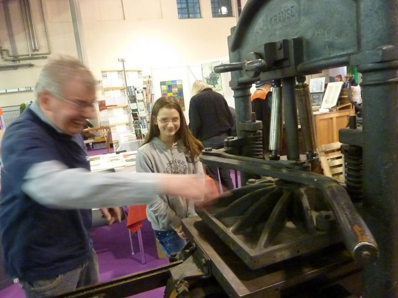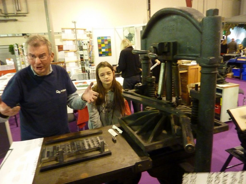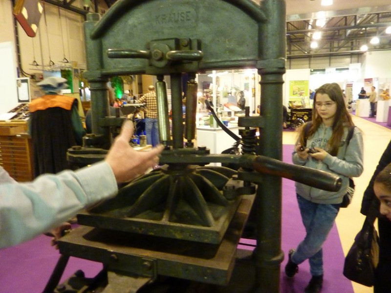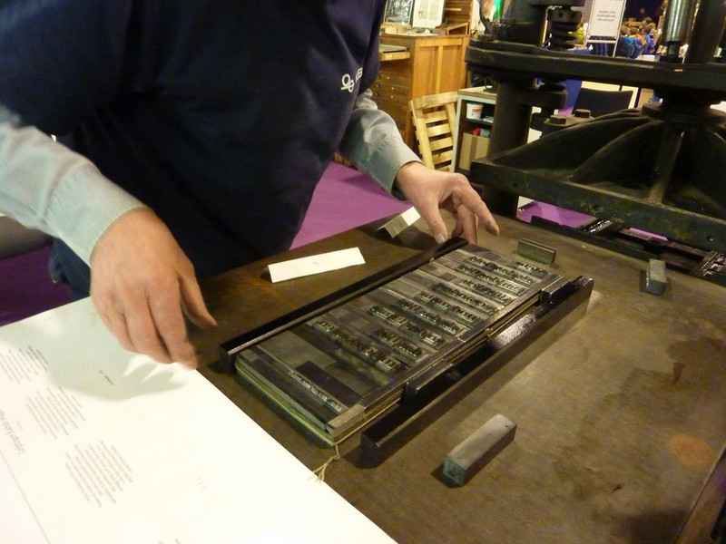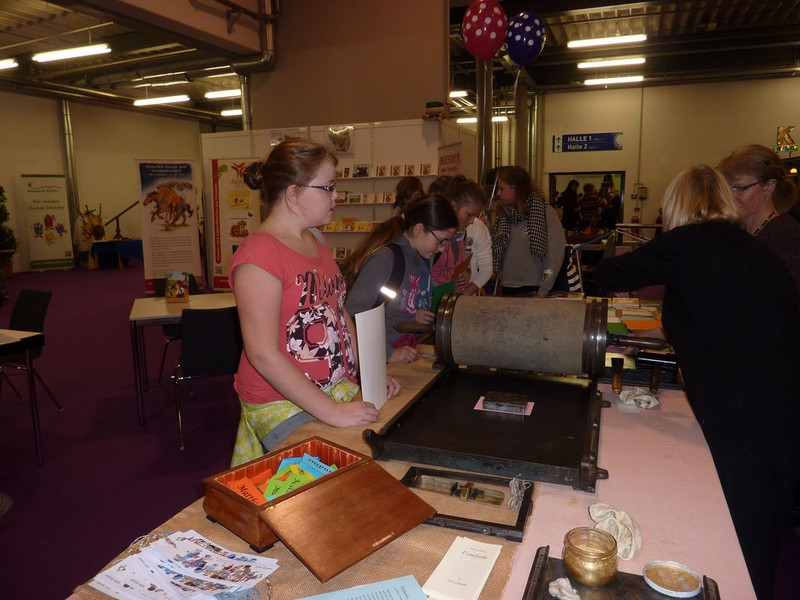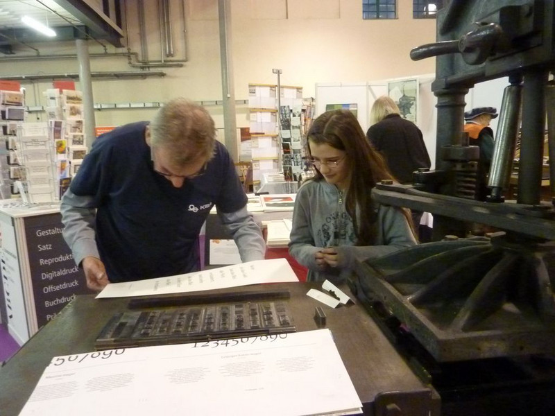 Endlich konnten wir verschiedene Druckerpressen sehen und auch damit drucken. Es gab auch Stände mit anderen Schreibgeräten, wie Federn oder Schreibmaschinen. Dort konnten wir selbst tätig werden.