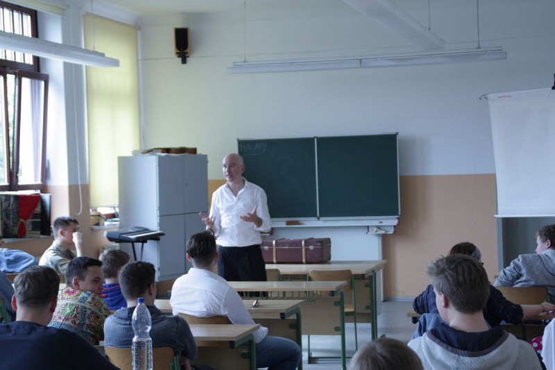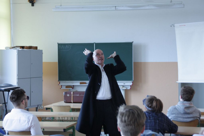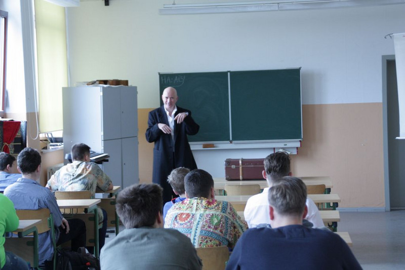 Ein Schüler zeichnete ein Pentagramm. Der Schauspieler hat das Stück sehr emotional und lustig vorgetragen.