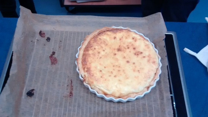 Als erstes nimmt man eine Form, in diese drückt man den Blätterteig unten an den Boden und an die Seite. Danach füllt man die 2 Becher Crème Fraîche und die 4 Eier in eine extra Schüssel und verrührt beide Zutaten bis sie keine Klumpen mehr hat. In dieser Zeit heizt man den Herd mit 200°C Umluft vor. Nun verteilt man die Schinkenwürfel auf den Blätterteig. Darüber füllt man das Gemisch aus den Eiern und der Crème Fraîche. Danach verteilt man so viel geriebenen Käse darauf, bis alles damit ausgefüllt ist. Jetzt kommt die Form in den Backofen mit 180°C Umluft für 30- 40 min.