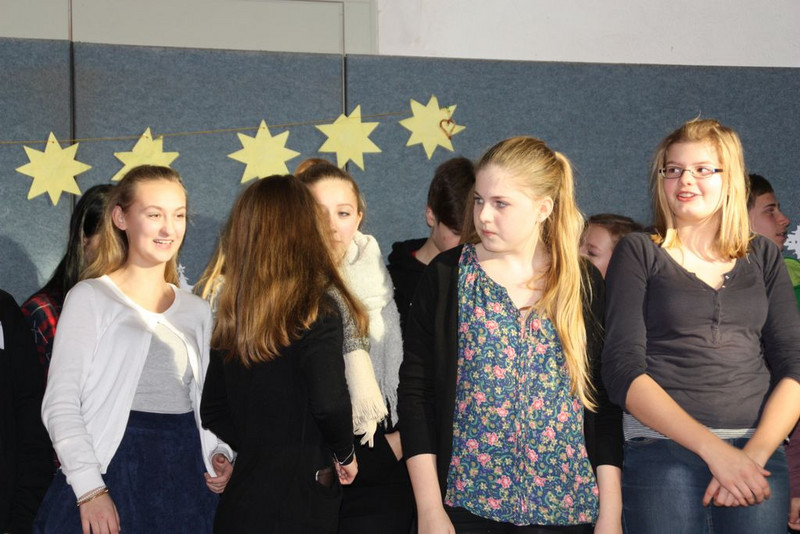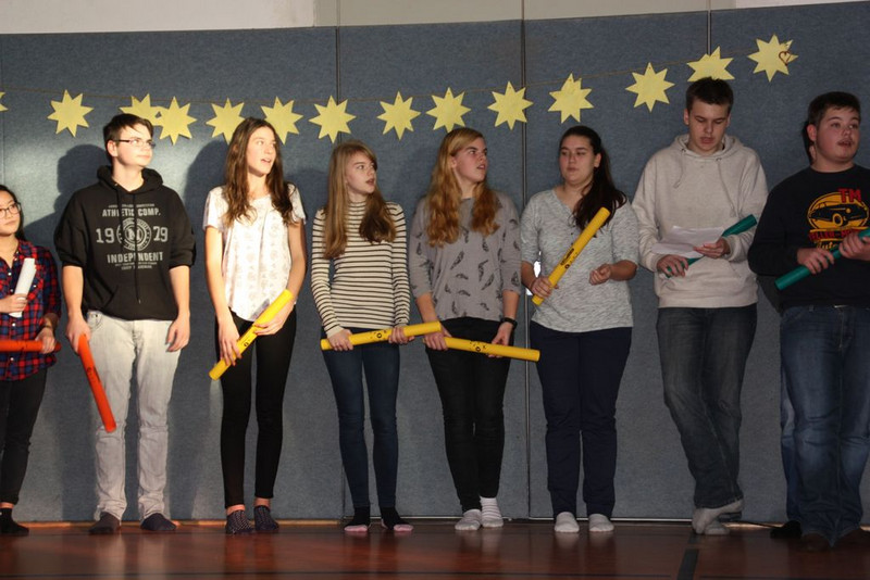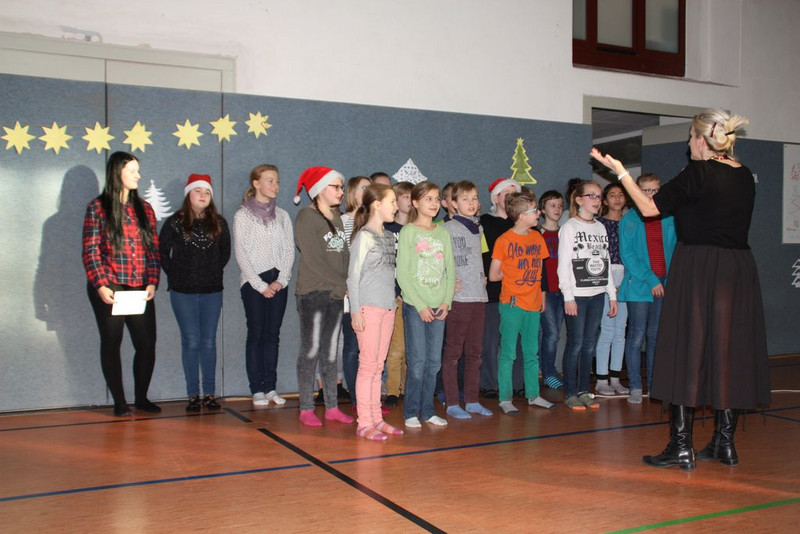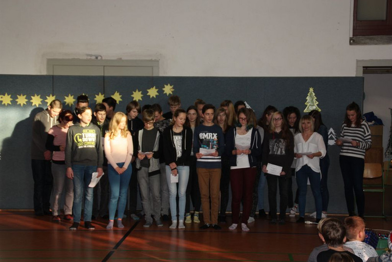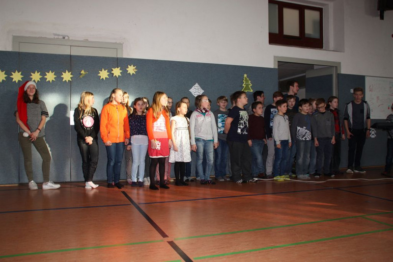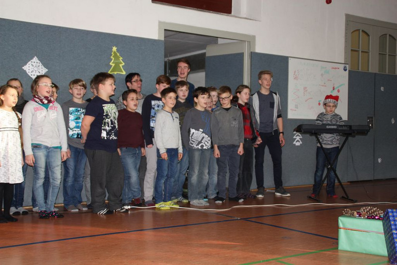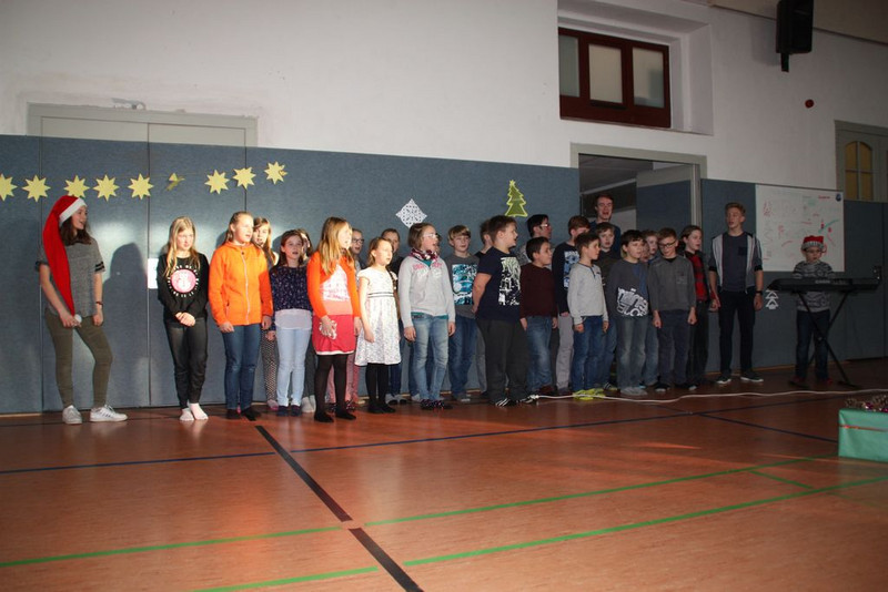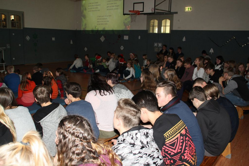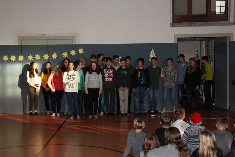 Auch in diesem Schuljahr fand am letzten Schultag vor den Weihnachtsferien ein gemeinsames Singen aller Klassen statt. Dazu hatte jede Klasse unter Leitung des Musikkurses der Klasse 10 ein Weihnachtslied ausgewählt und vorbereitet. Durch die räumliche Trennung mit der Außenstelle Augustusweg fand in diesem Schuljahr das Singen in beiden Schulgebäuden parallel statt.