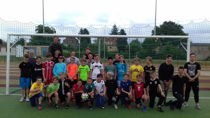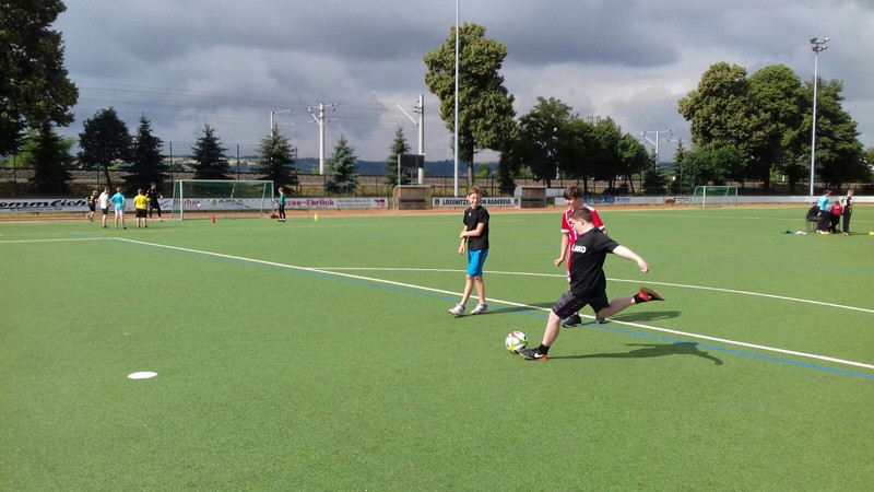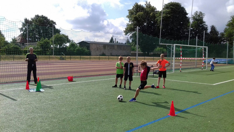 Anlässlich der Fußball-Weltmeisterschaft trafen sich zum Auftakt der letzten Schulwoche 21 Jungen der 6. Klassen im Lößnitzstadion, um an den Prüfungen zum Erwerb des DFB-Fußball-Abzeichens teilzunehmen.