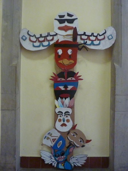 Die Schüler des Neigungskurses „Die Vielfalt der bildenden Kunst“ Klasse 8 gestalteten einen erdachten Totempfahl, dem wir im Schulhaus einen Ehrenplatz gegeben haben. Er besteht aus vielen Schichten bemalter Wellpappe und wurde ganz exakt geschnitten. Jeder Schüler ließ seiner Fantasie freien Lauf.