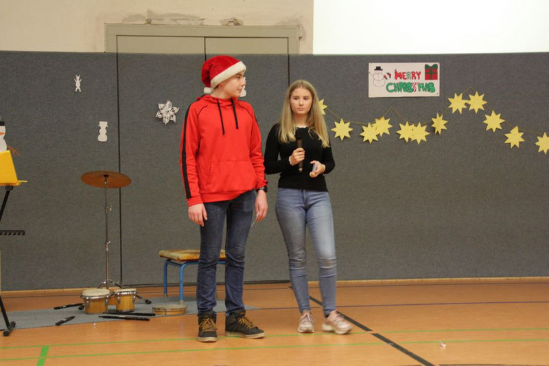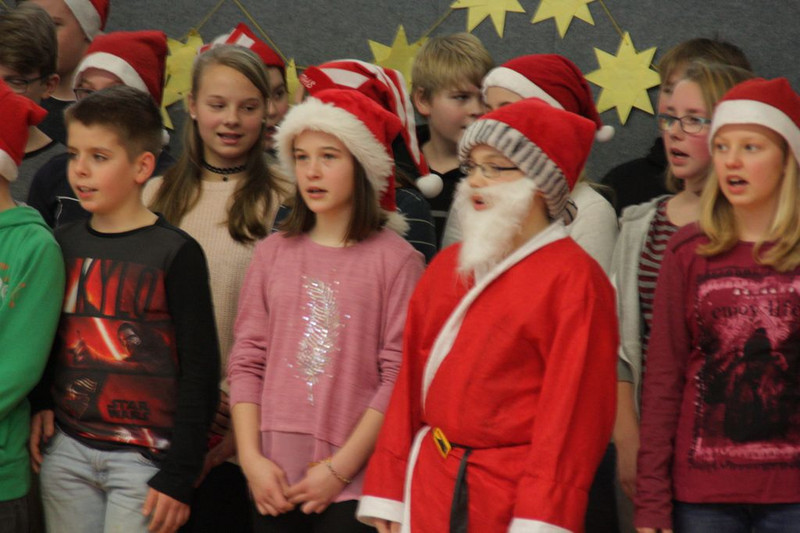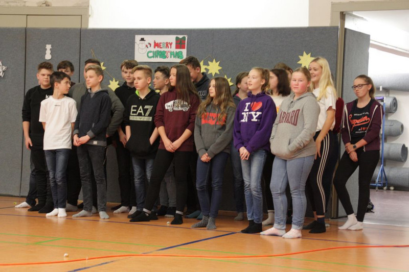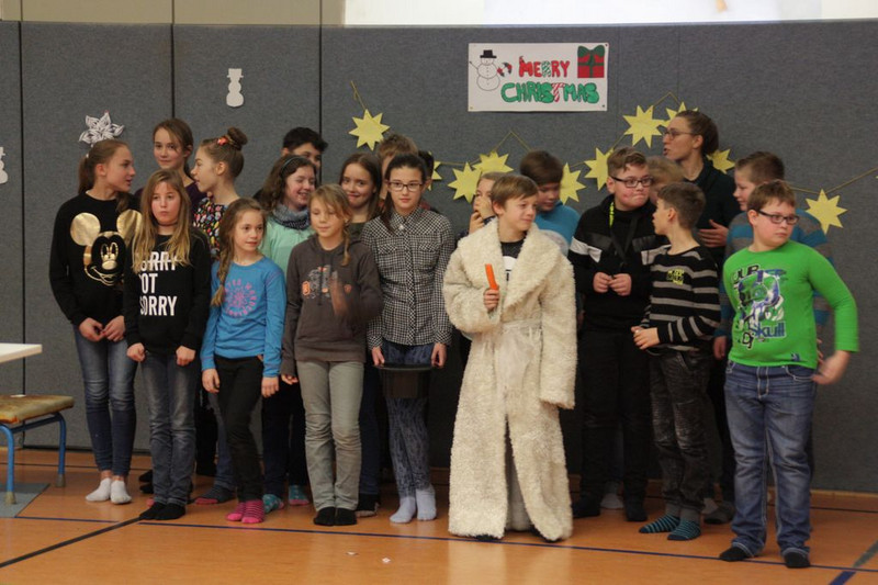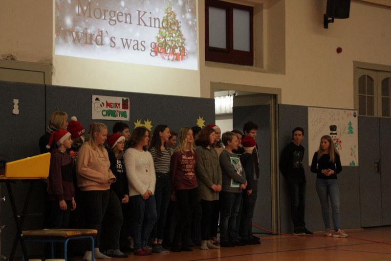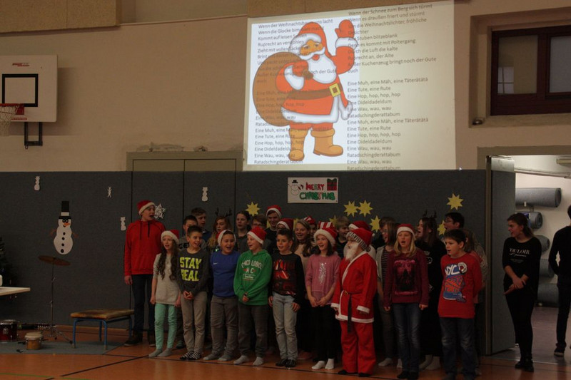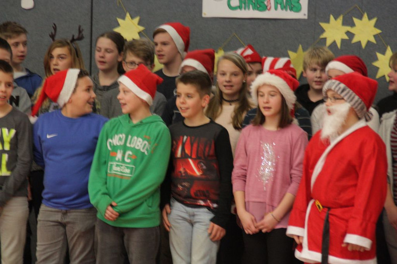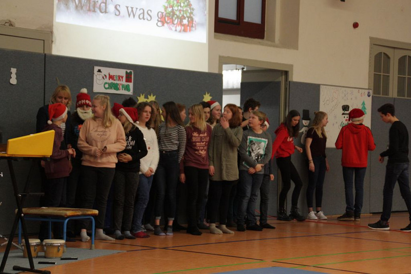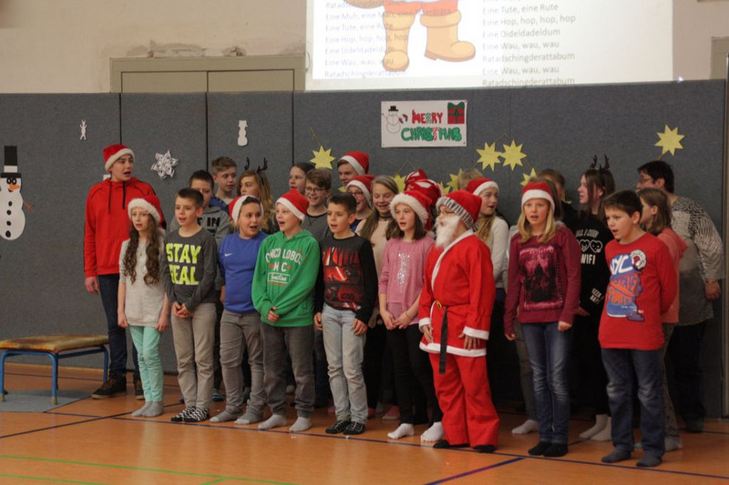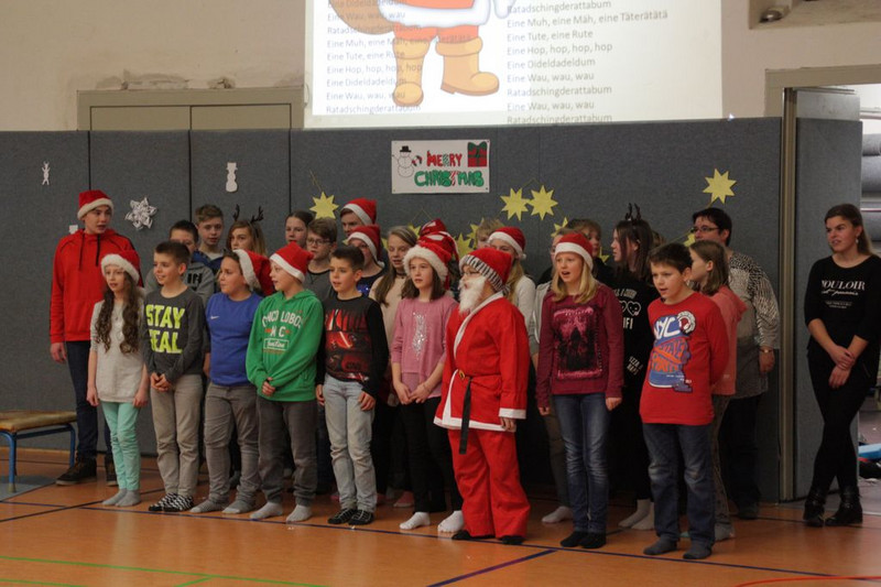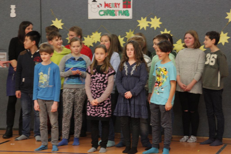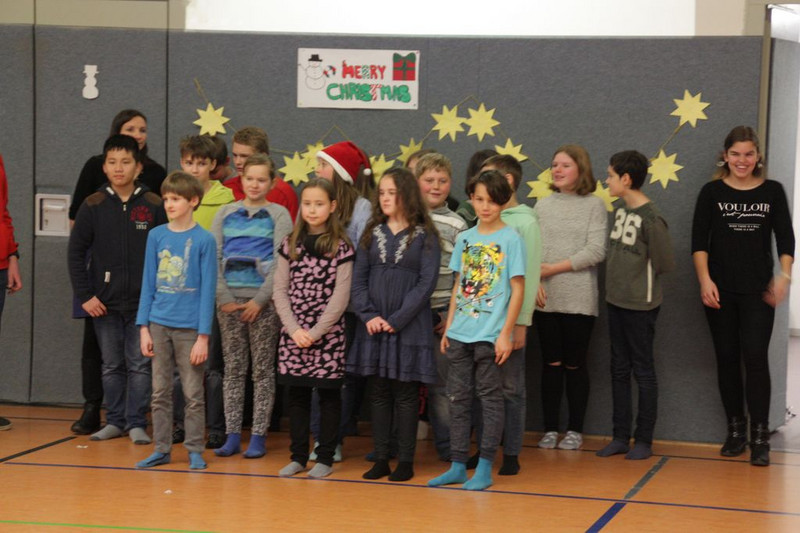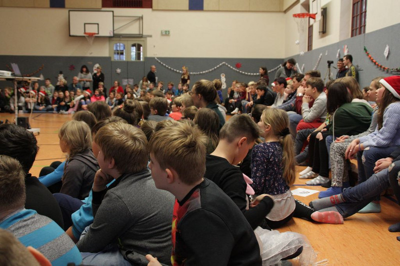 Bevor es in die Weihnachtsferien ging, trafen sich traditionell alle Klassen in der Turnhalle zum gemeinsamen musizieren. Jede Klasse hatte einen weihnachtlichen Beitrag vorbereitet.