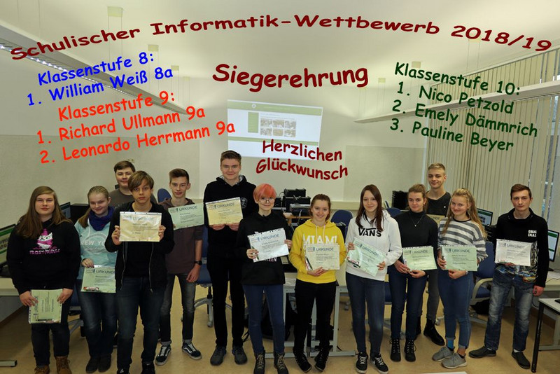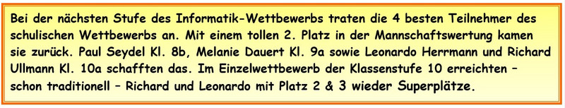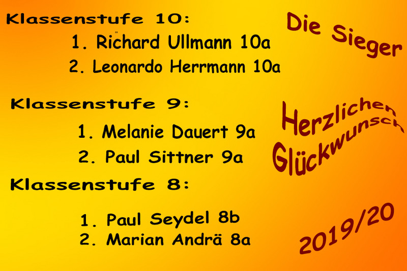 Erneut ein Superergebnis in Mittweida - wir konnten den Pokal des Vorjahres verteidigen. Tolle Ergebnisse aller unserer Teilnehmer waren ausschlaggebend. In Klassenstufe 8 und 10 verpassten William Weiß und Nico Petzold sehr knapp die Medaillenplätze. Herausragend aber die beiden Schüler der Klassenstufe 9 - Richard Ullmann und Leonardo Herrmann belegten mit Spitzen - Punktzahlen souverän die Plätze 1 und 2. ... HERZLICHEN GLÜCKWUNSCH ...