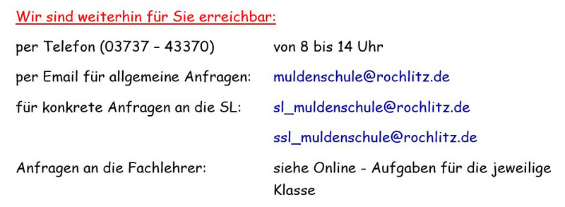 Willkommen auf der Homepage der Mittelschule Rochlitz. Hier sind eher die Informationen zum aktuellen schulischen Leben enthalten. Historisches und Rückblickendes erfährt man auch weiterhin auf der alten Homepage, die ursprünglich vor über 17 Jahren während einer Projektwoche der Mittelschule "Am Regenbogen" Rochlitz entstand.