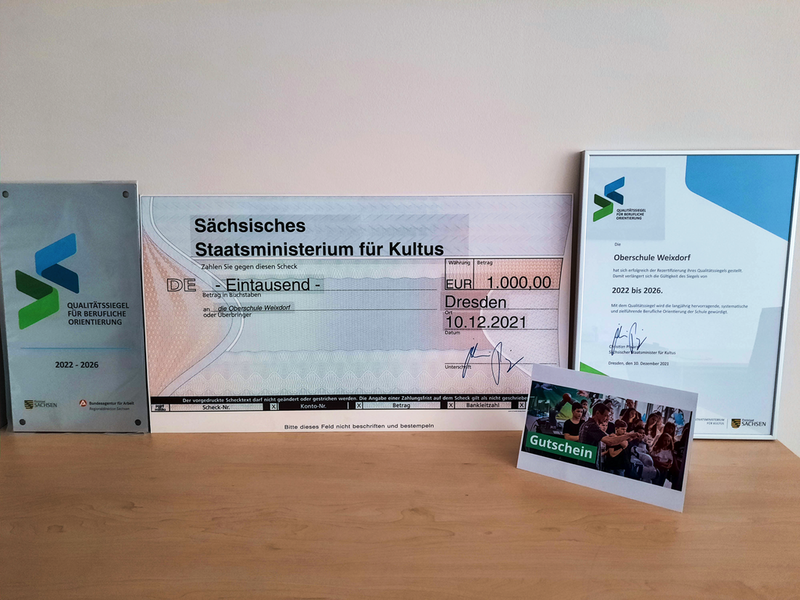 Höhepunkt und Startschuss zur Messe war die Übergabe des erfolgreich rezertifizierten sächsischen Qualitätssiegels zur Beruflichen Orientierung. Bereits im Dezember 2021 stellte sich das Team Berufsorientierung der Oberschule Weixdorf dem digitalen Audit, auch unter Mitwirkung von Eltern und Schülern.