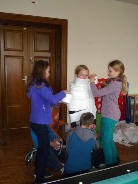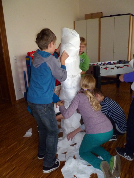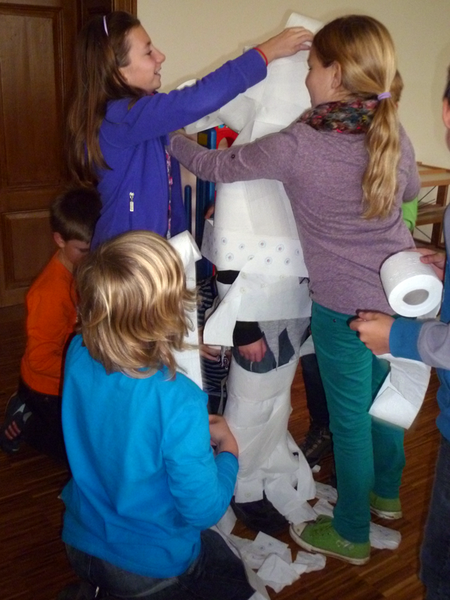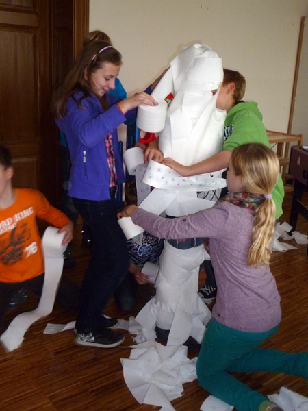 So sangen sie einen Rap, absolvierten ein Quiz, wickelten eine Mumie, bastelten Kürbisgirlanden aus Papier, suchten den schnellsten Spinnenwickler und ließen sich schminken. Bei allen Aktionen wurden sie von Schülern der Klasse 7b betreut und begleitet. Höhepunkt war das gemeinsame Muffinessen und die Auszeichnung der 3 bestgestaltetsten Kürbisse.