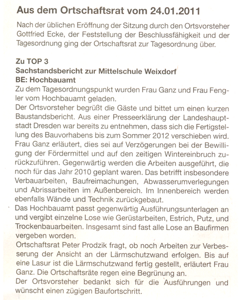Informationen zum Baustand aus den Weixdorfer Nachrichten Nr. 2 vom 04.02.2011