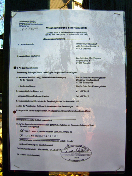 Am 3. November 2010 erhielten wir, die Schüler und Lehrer der Mittelschule Weixdorf, die Information, dass der Fördermittelbescheid bei der Stadt Dresden eingegangen ist und somit ab 4. November 2010 die Bauarbeiten zur Sanierung und dem Neubau in vollem Umfang beginnen können.