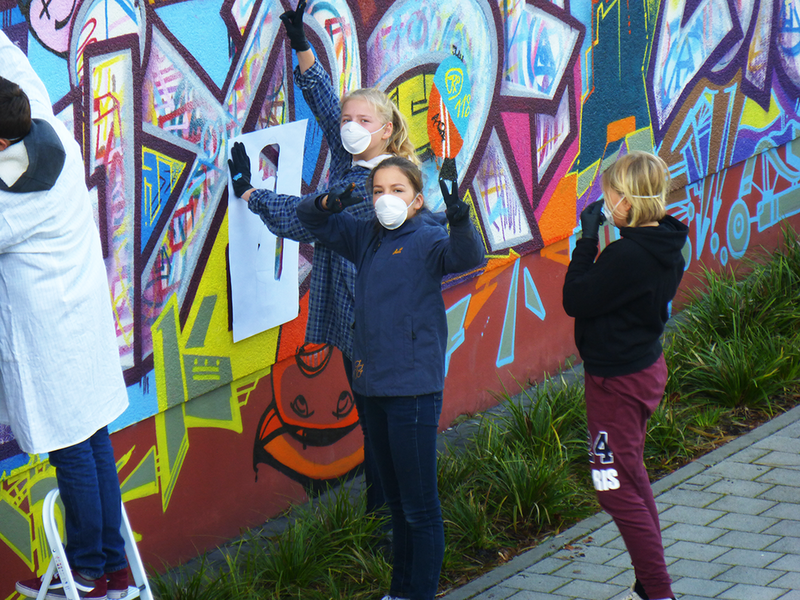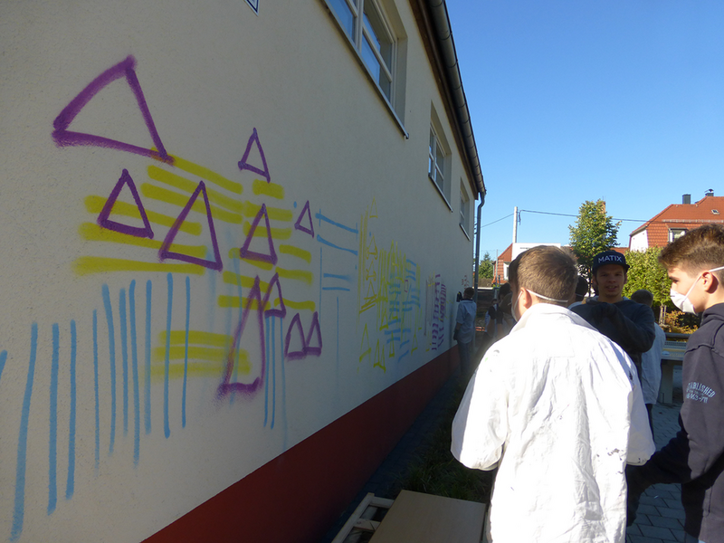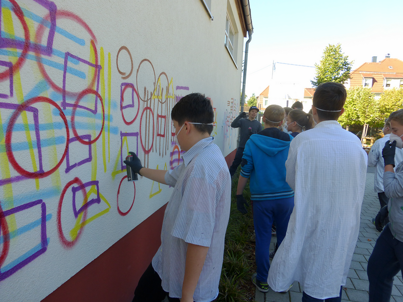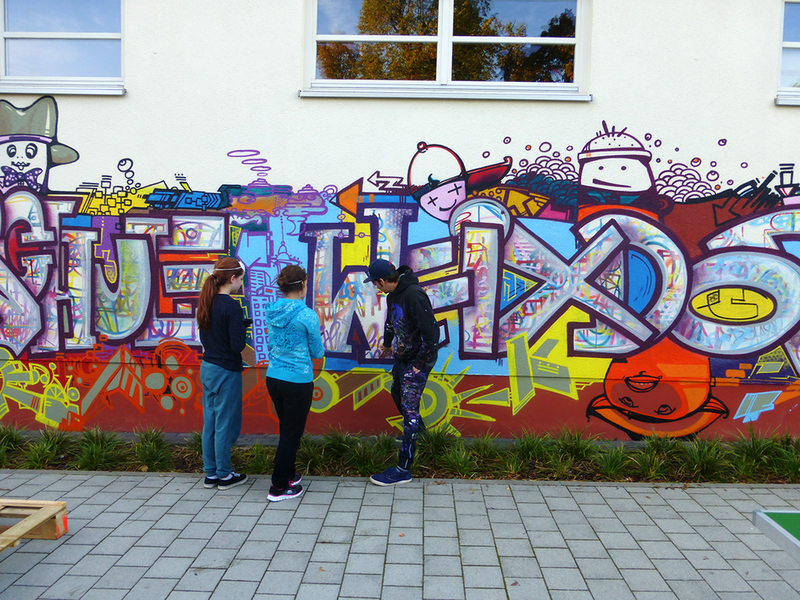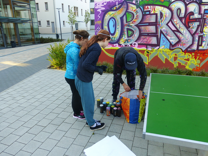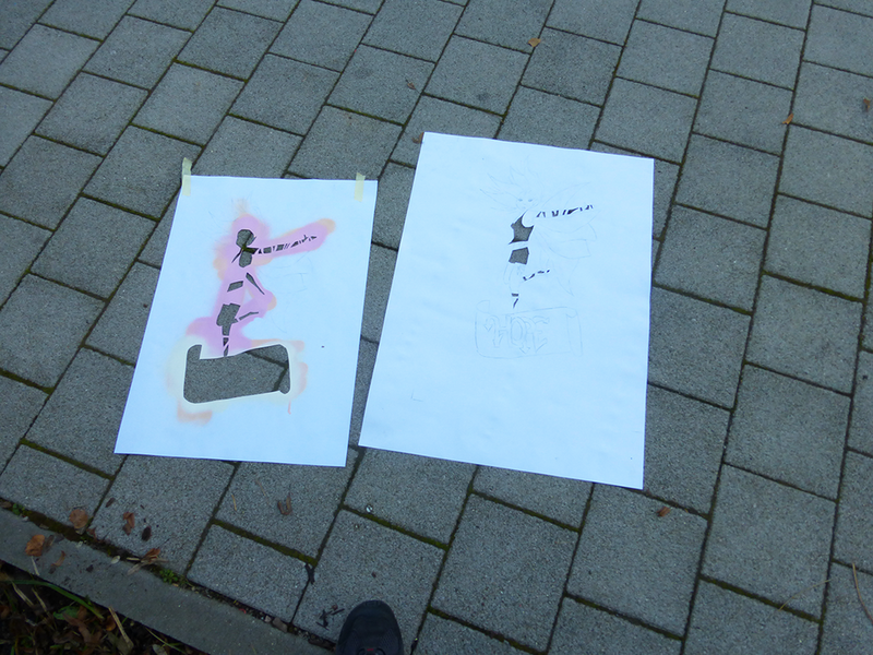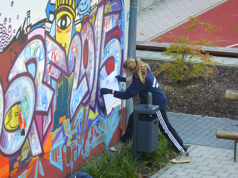 Als sie am 1. Oktober gekommen sind, haben sie erst einmal allen die Grundlagen beigebracht. Mit der Schrift angefangen, dann zum Character, zum Tag und am Ende wurden die Schablonen begonnen. Während alle arbeiteten, haben Benjamin und Oscar Fragen beantwortet und geholfen. Teilweise war es wirklich anstrengend, die Schablonen auszuschneiden, da jede Schablone exakt gleich sein musste. Das Graffiti sollte später nicht schief werden. Am 2. Oktober wurden die letzten Schablonen fertig gestellt und die Motive an die Wand gesprayt. Das Endergebnis kann man nun jeden Tag sehen, wenn man in die Schule hineingeht.