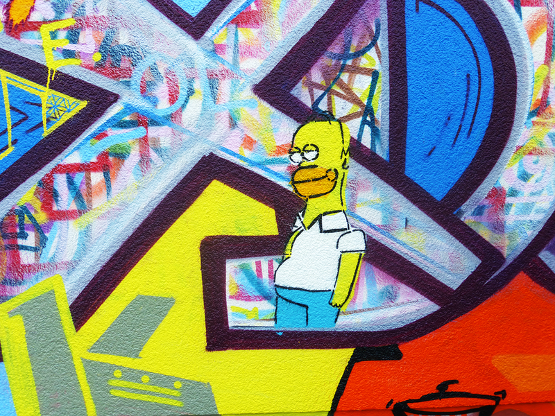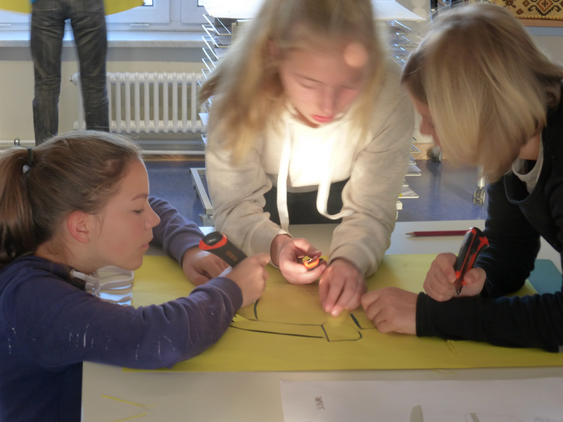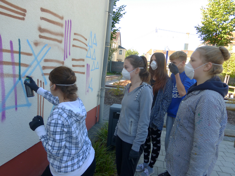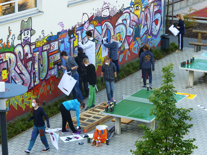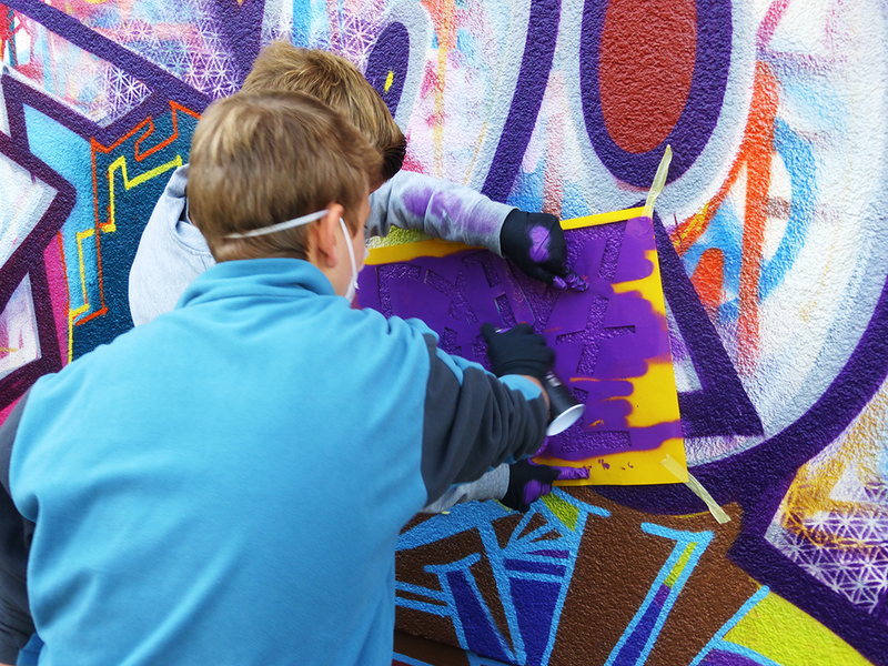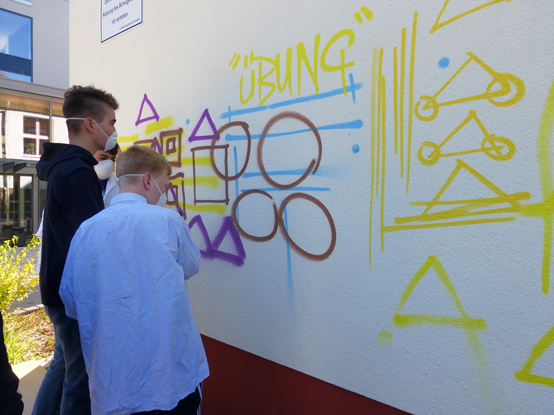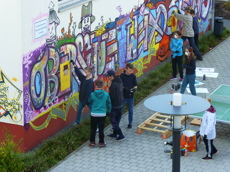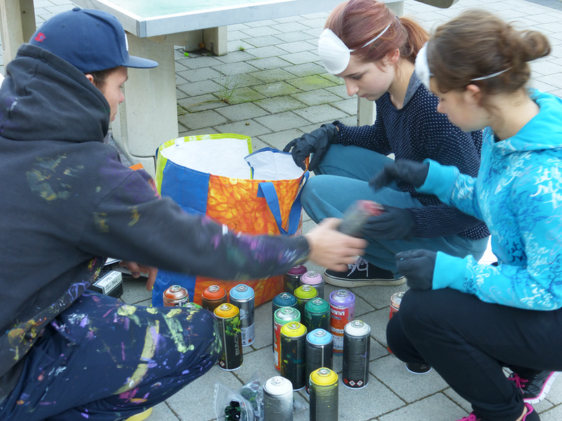 Als sie am 1. Oktober gekommen sind, haben sie erst einmal allen die Grundlagen beigebracht. Mit der Schrift angefangen, dann zum Character, zum Tag und am Ende wurden die Schablonen begonnen. Während alle arbeiteten, haben Benjamin und Oscar Fragen beantwortet und geholfen. Teilweise war es wirklich anstrengend, die Schablonen auszuschneiden, da jede Schablone exakt gleich sein musste. Das Graffiti sollte später nicht schief werden. Am 2. Oktober wurden die letzten Schablonen fertig gestellt und die Motive an die Wand gesprayt. Das Endergebnis kann man nun jeden Tag sehen, wenn man in die Schule hineingeht.