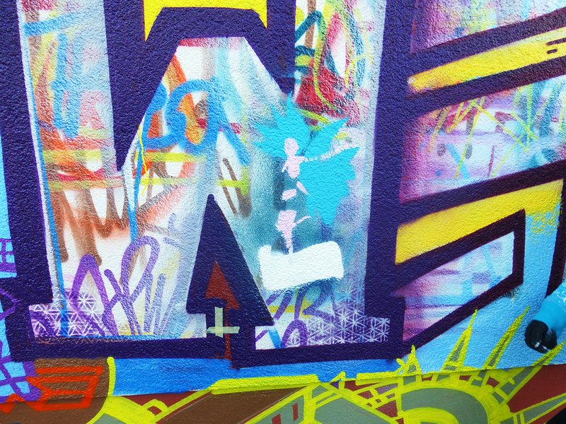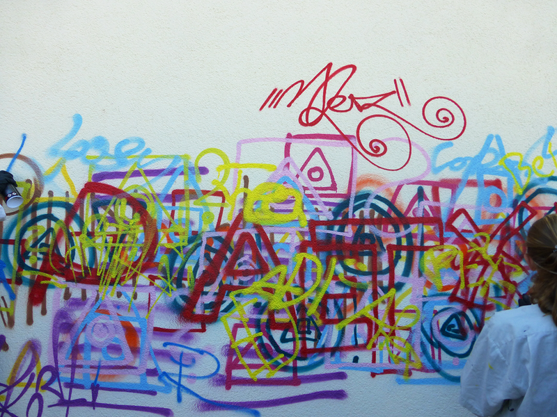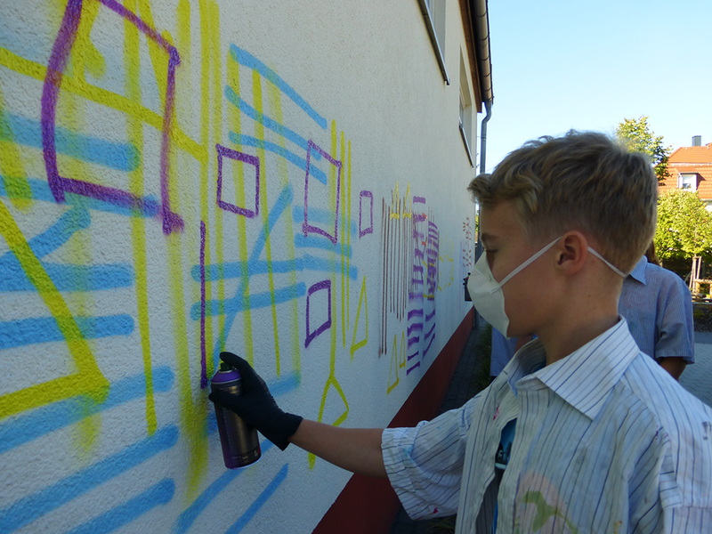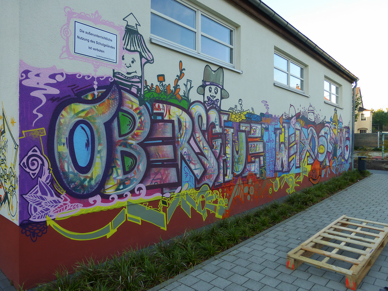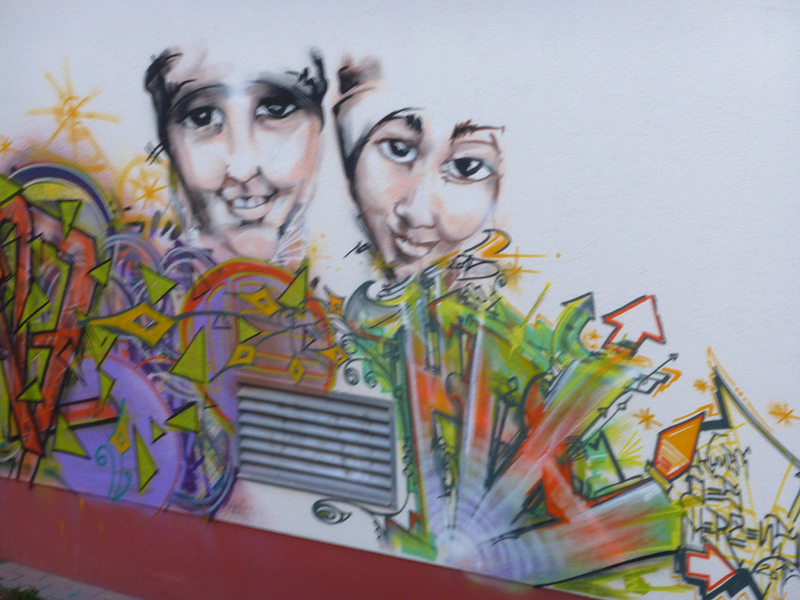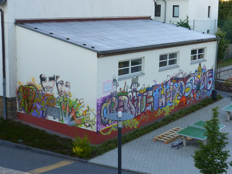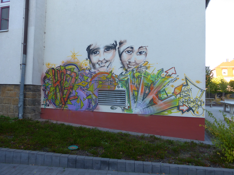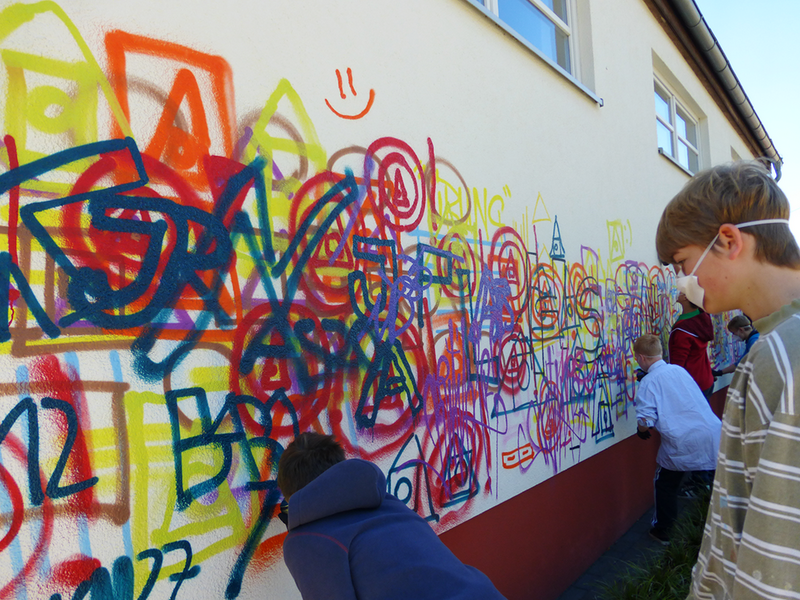 Benjamin (Kunst des Herzens) an einem Graffiti, welches an die Turnhallenwand gesprüht wurde. Die Klasse hat dieses Projekt bei dem „Be smart- don’t start“ - Wettbewerb gewonnen. Die beiden sind seit ca. 15 Jahren selbst Sprayer. Beide haben vorher schon gern gezeichnet und dann im Alter von etwa 14 Jahren angefangen mit der Dose zu malen.
