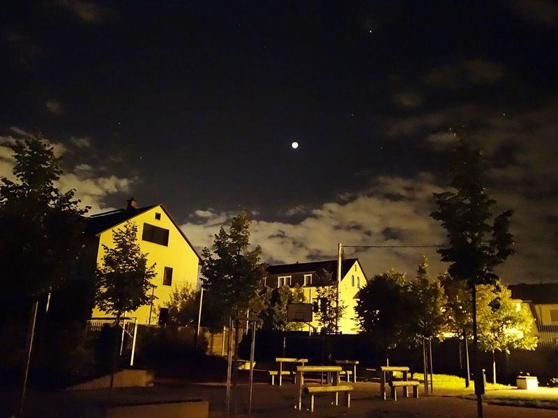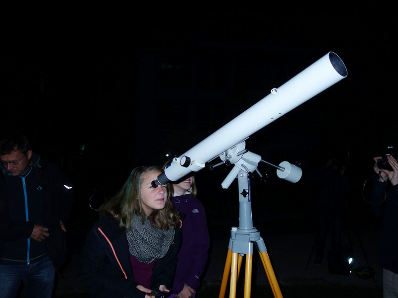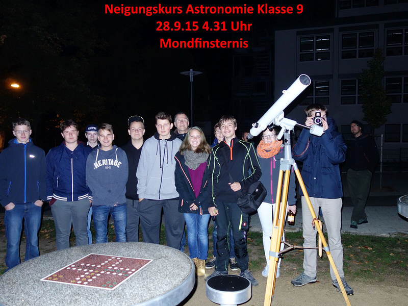 Die Schüler des Neigungskurses Astronomie der Klassenstufe 9 hatten sich den Wecker rechtzeitig gestellt und es sich nicht nehmen lassen schon 4 Uhr früh auf dem Schulhof zu sein. So zeitig hat die Schule wohl noch nie Schüler gesehen! Auch einige Väter wollten sich das Ereignis nicht entgehen lassen. Leider war die „Aussicht“ wetterbedingt nicht optimal, aber der Wolkenhimmel hat uns doch einige Momente der beeindruckenden Wirkung des sogenannten „Blutmondes“ gestattet.