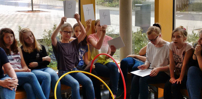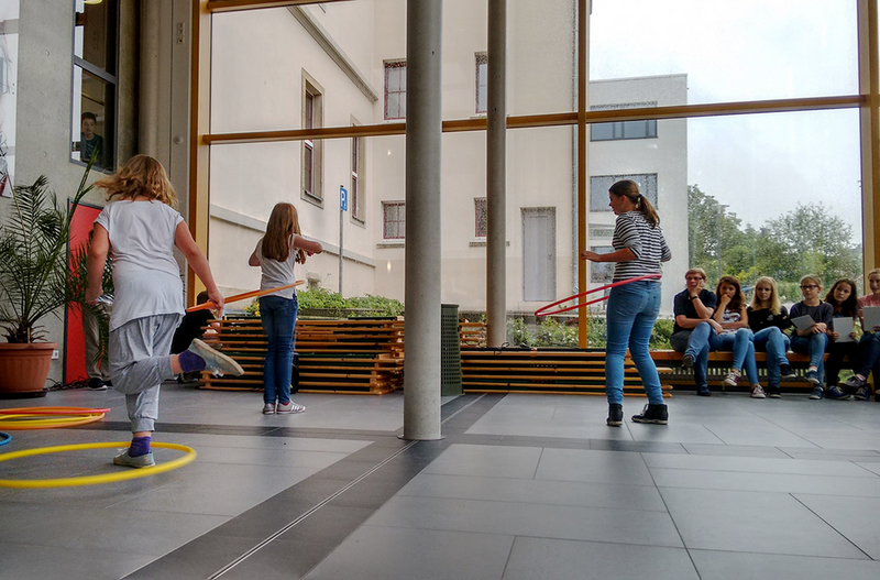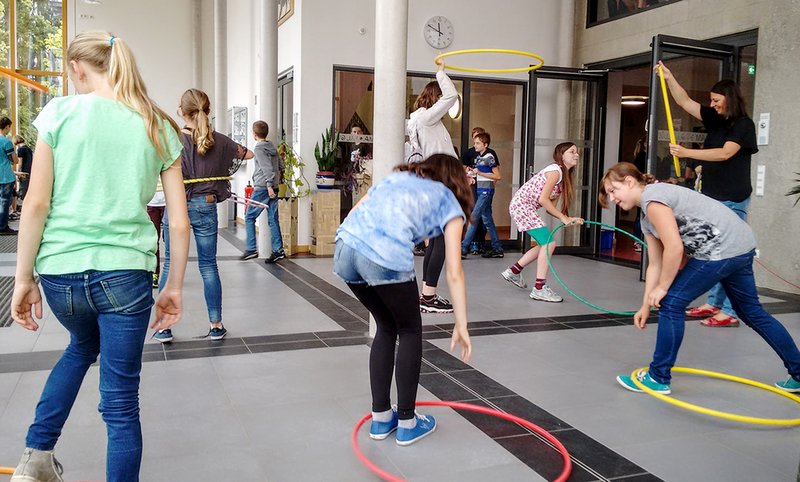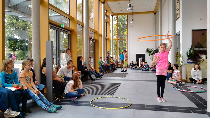 Die zweite Runde unseres Ausscheides musste am 15.Juni wegen Regen zwar in der Pausenhalle stattfinden, aber das bescherte den Teilnehmern wahrscheinlich noch mehr Zuschauer. Nach einer kurzen Erwärmung drehten sich zu flotter Musik wieder die bunten Reifen. Die Jury honorierte die Anstrengungen durch Punktanzeigen. Nach Ende des Wettbewerbs war der Funke auch auf viele Nichtteilnehmer übergesprungen und jeder durfte probieren. Wir hoffen sehr, dass es im nächsten Jahr noch mehr Schüler geben wird, die sich trauen, am öffentlichen Vergleich teilzunehmen.