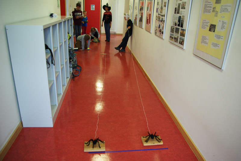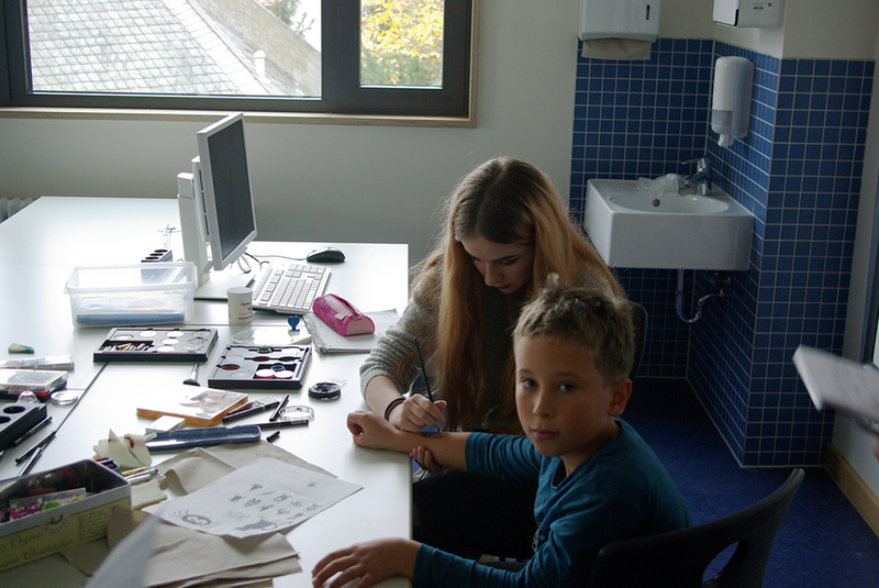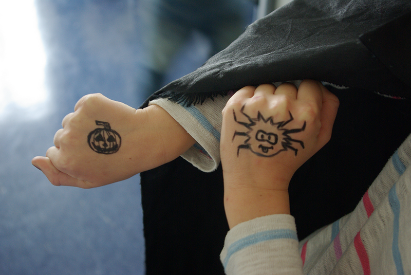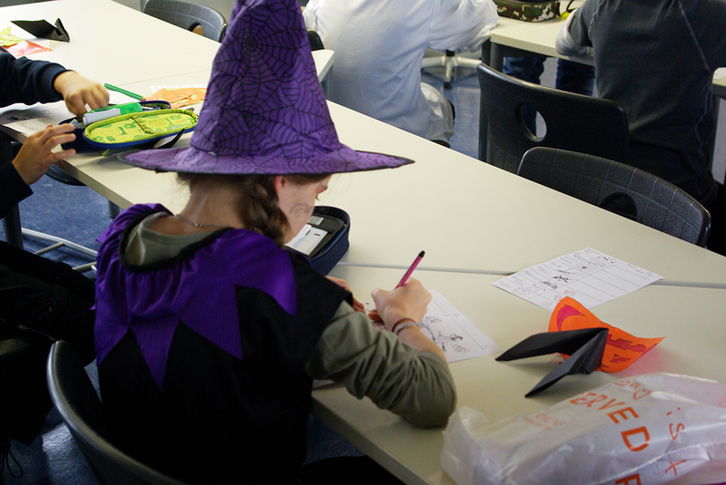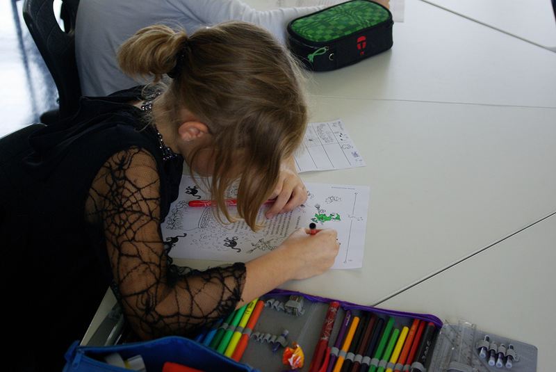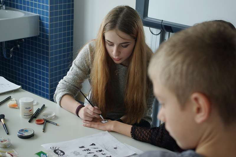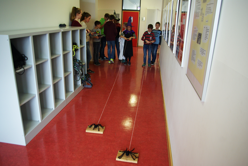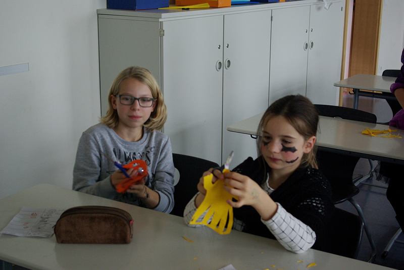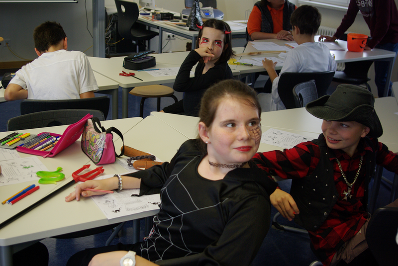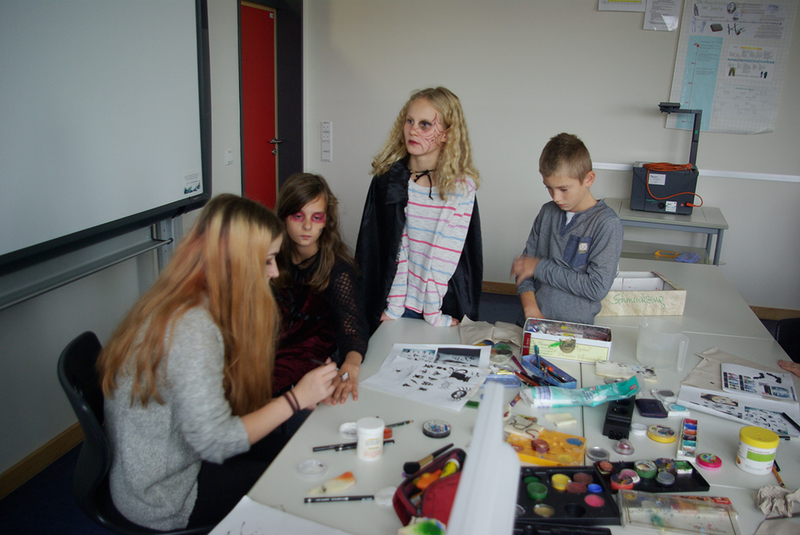 Unterstützt von einigen Lehrern und Schülern der Klasse 9b konnten die Jüngsten der Schule beim Spinnenwickeln gegeneinander antreten oder sich beim Basteln von Girlanden, Fensterbildern und Fledermäusen ausprobieren. Wer Lust hatte, konnte sich beim Schminken zudem mit gruseligen Motiven wie Spinnen, Fledermäusen oder Totenköpfen bemalen lassen.
