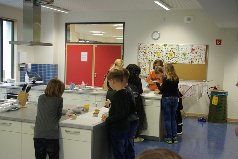 Es ist allzu verständlich, wenn man nach so vielen Stationen eine kleine Stärkung nötig hat. In der Küche standen deshalb für alle Schüler Muffins bereit. Doch wer beim Anblick der Köstlichkeiten gedanklich schon mit einem Muffin in der Hand am Tisch saß, der hatte sich zu früh gefreut, denn es galt, wer einen Muffin essen möchte, muss diesen auch verzieren. Hierzu konnte man Zuckerglasur, Streusel und andere Zutaten verwenden. Hauptsache, der Muffin sieht zum Schluss schön aus und schmeckt.