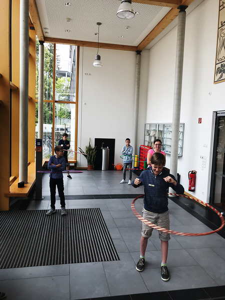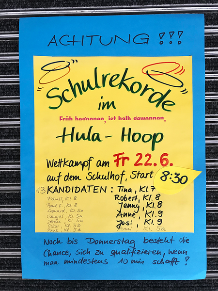 Zum ersten Hula - Hoop - Wettkampf am 22.06.2018 qualifizierten sich insgesamt 13 Teilnehmer aus den Klassen 5 bis 9, welche im Vorausscheid mindestens 10 min den Reifen um die Hüfte schwingen konnten. Neun dieser Schüler stellten sich am Freitag ab 8:45 Uhr der Herausforderung. Für ausreichend Energie sorgte die Schulsozialarbeit mit gesunden Getränken und Snacks und motivierende Musik erklang im Hintergrund. Während der Weltrekord bei über 70 Stunden liegt, hofften wir insgeheim, vielleicht einen Rekord von einer Stunde aufzustellen.