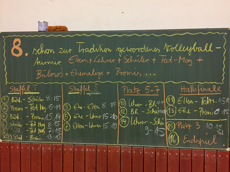Traditionell dabei waren je eine Schüler-, Eltern- und Lehrermannschaft sowie die Mannschaften unserer beiden Partnerbetriebe Federal Mogul und Bülow Palais. Das Teilnehmerfeld ergänzten ein Team von ehemaligen Schülern und eine Prominentenauswahl. Die Kapitäne der sieben Mannschaften losten dabei folgende Vorrundengruppen aus: