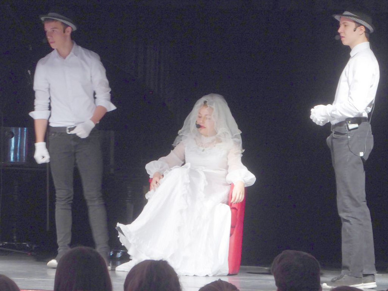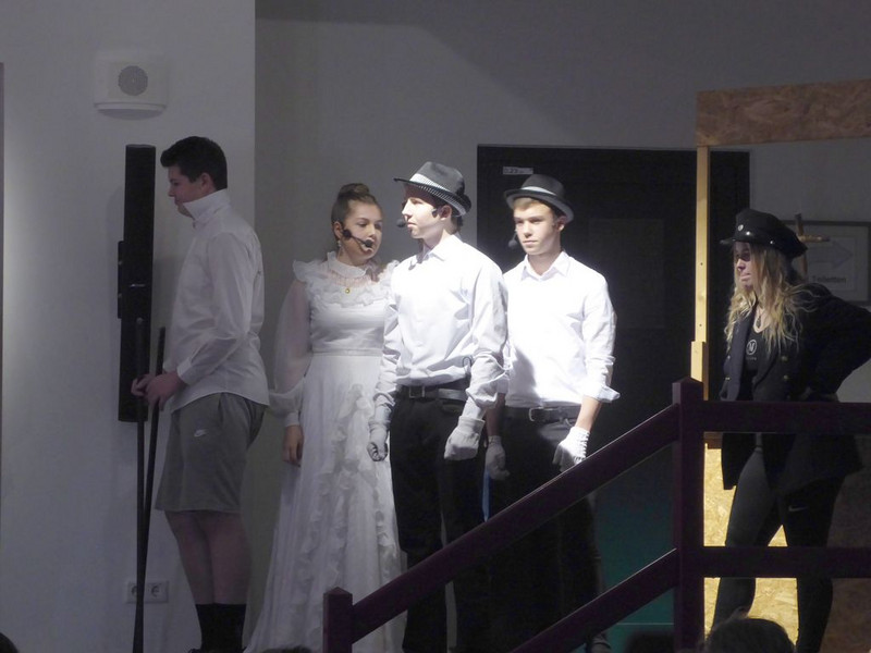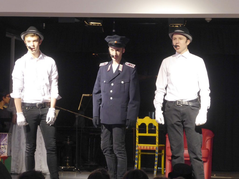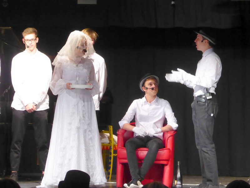 Michael springt ein und spielt nun 2 Rollen. Die Premiere ist gerettet. Mit großer Souveränität spielen die Schüler des Musikkurses ihre Rollen aus der „3 Groschenoper“.