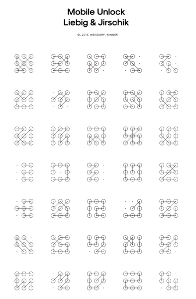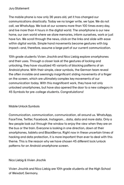 Mit dem Gedanken an die Wichtigkeit der „Kommunikation“ aber auch des Schutzes persönlicher Daten in der heutigen Zeit, beteiligten sich Vivien und Nico am Call 2018 des „PHAISTOS PROJECT - 45 SYMBOLS“. Die Idee war, 45 verschiedene Handysperrmöglichkeiten als Grafiken umzusetzen. Nach etlichen Skizzen und der Erstellung einer allgemeinen Vorlage gingen die beiden an die Umsetzung und zeichneten in einem Vektorgrafikprogramm 45 verschiedene Handysperrvarianten mit dem entsprechenden Weg auf dem Sperrbildschirm.