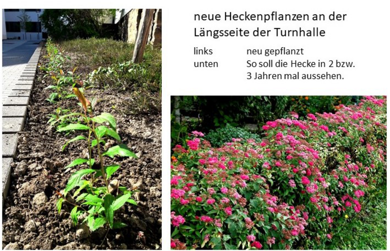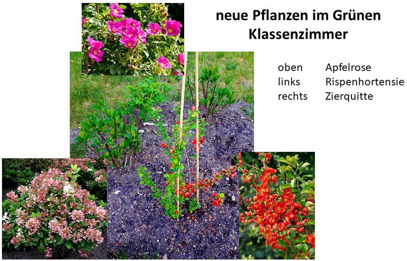 Im Grünen Klassenzimmer wurden Apfelrose, Rispenhortensie und Zierquitte gepflanzt, die in unterschiedlichen Farben blühen werden. Außerdem ist noch die Pflanzung von dreifarbigen Sommerflieder geplant, welcher ein besonderer Anziehungspunkt für Schmetterlinge ist. Diese Pflanzen bekommen wir hoffentlich in den nächsten Tagen.