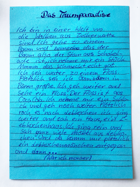 Am 11.12. gibt es noch einmal ein Traumglas und Traum von einer weiteren Emma aus der Klassenstufe 5. Genauso schön und zauberhaft wie am 01.12. … (Wie der Riese in Roald Dahls Buch haben wir Träume aufgeschriebe und uns nicht an die Regeln der Rechtschreibung halten müssen.)