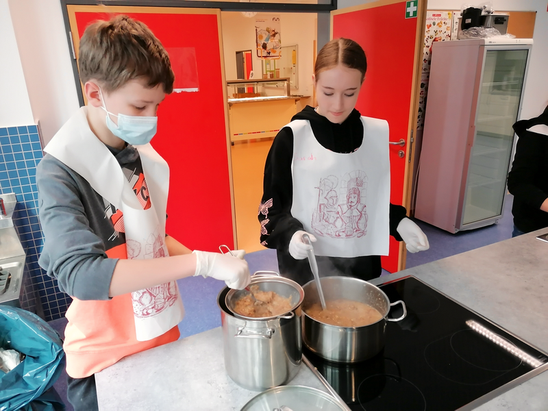 Am Freitag stand die Wahl zwischen mittelalterlichem Kochen und Tanz/Kunst. Uns wurde mit dem Lied „Ich bin der Doktor Eisenbart“ die mittelalterliche Musik nähergebracht und wir konnten auf der Bühne schauspielerische Übungen durchführen. Beim mittelalterlichen Kochen haben wir festgestellt, wie anstrengend es war zum Beispiel eine Brotsuppe zuzubereiten, die auch geschmacklich ganz anders war als unser heutiges Essen. Besonders lecker fanden wir die „armen Ritter“. Im dritten Block haben sich alle beiden 6. Klassen in der Aula versammelt und über die Inhalte der Woche gesprochen, eine Kampfvorführung gesehen, Essen und Bonbons probiert sowie ein Feedback gegeben, wie es uns gefallen hat. Nach einer abwechslungsreichen Projektwoche ging es dann für alle ins wohlverdiente Wochenende.