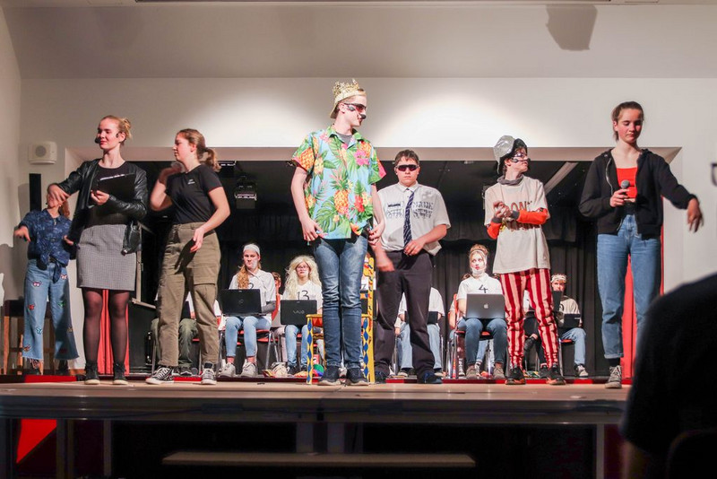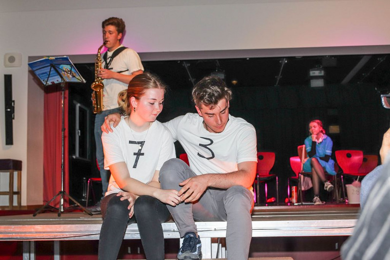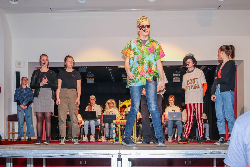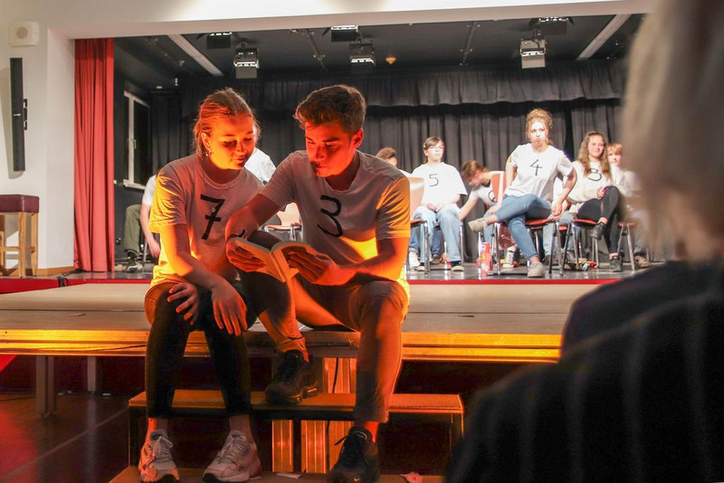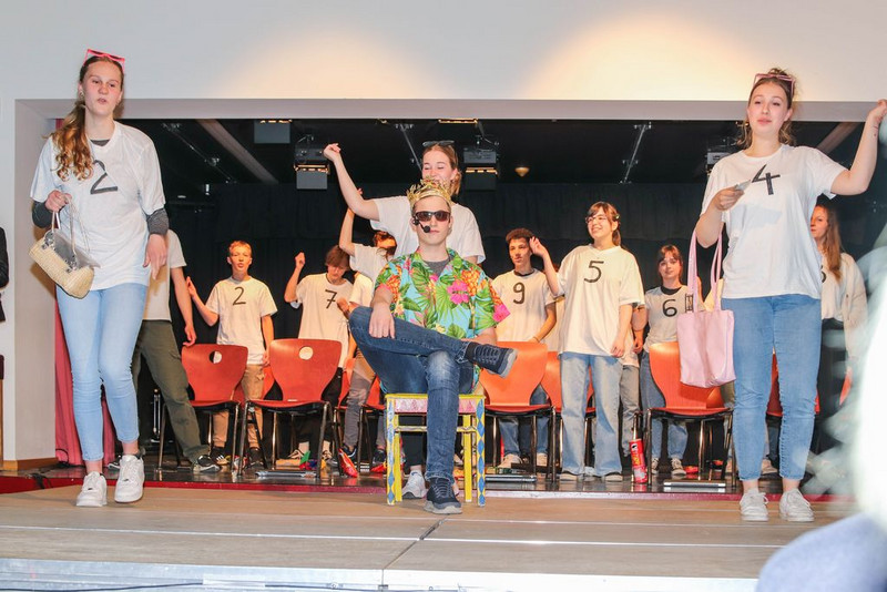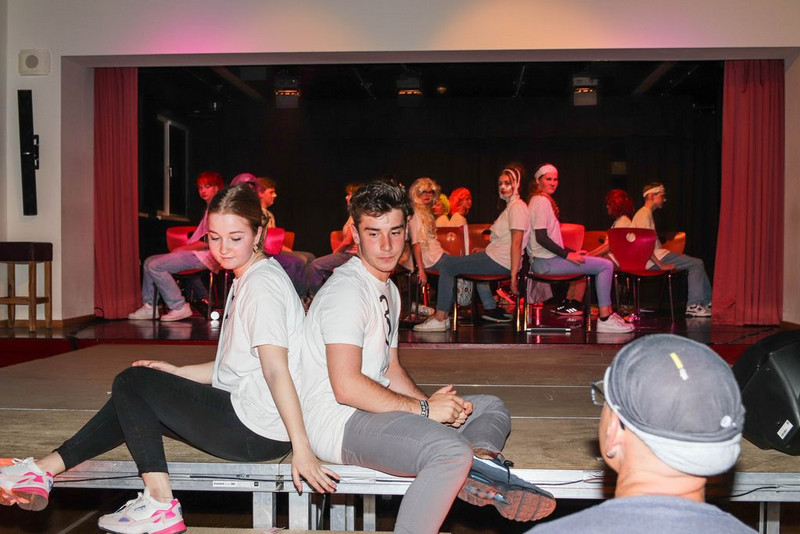 Den zum Teil in Schweizer Deutsch geschriebenen Text haben sich die Schüler selber umgeschrieben, sich Tanzchoreographien ausgedacht und, wegen coronabedingter Ausfälle, Texte von anderen Schülern spontan übernommen. Manchmal fehlten so viele, dass wir Szenen nicht -oder unchronologisch proben mussten.