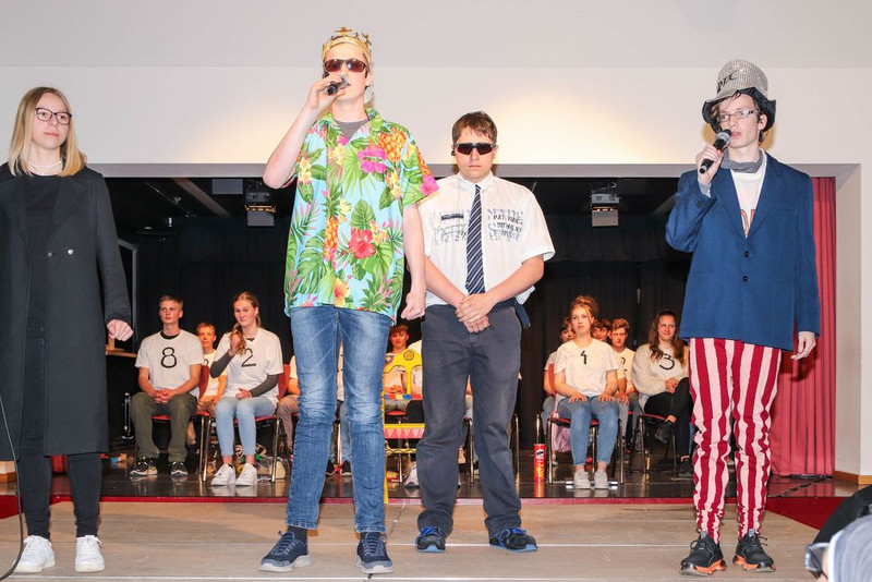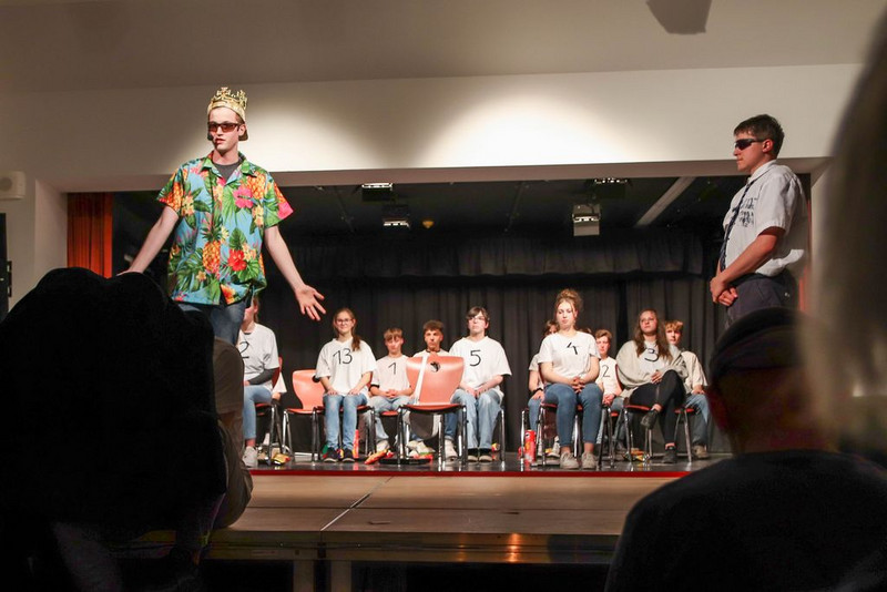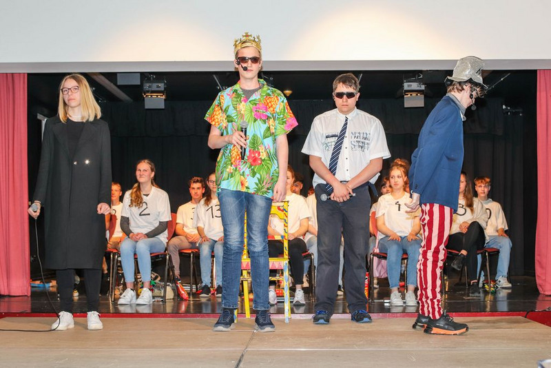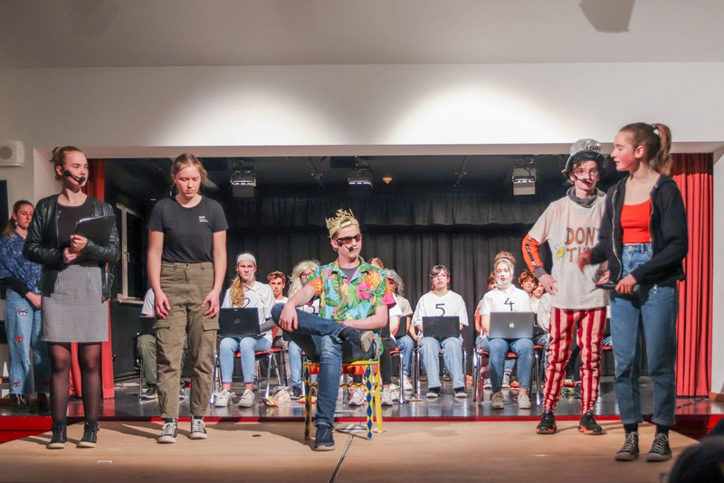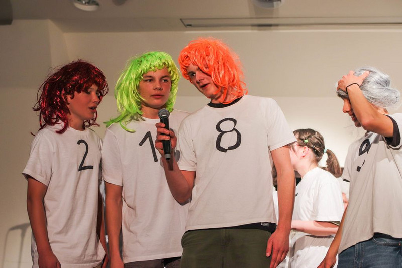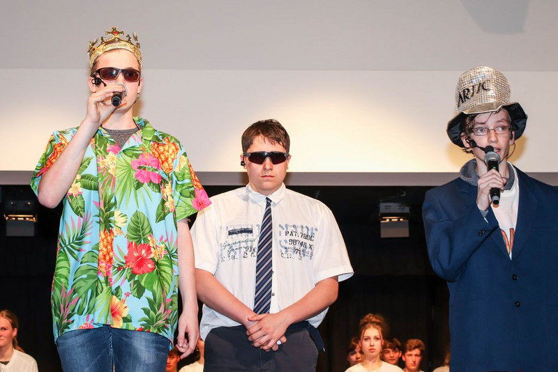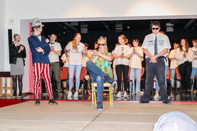 Wir haben uns Zeit genommen, uns an die Figuren im Stück heran zu improvisieren. Herausgekommen ist z.B. ein toller König, gespielt von Clemens, in Hawaiihemd mit Basecap, Sonnenbrille und Zigarre. Oder ein Moderatorenteam bestehend aus einem alten, langsamen Herrn mit Fliege und Krückstock und einem hyperaktiven Jungspund im Glitzeranzug. Es war jedes Mal ein spielerischer Hochgenuss, wenn Iven und Finn ihren Auftritt hatten. Damit alle Schüler eine Rolle spielen können, haben wir noch Figuren dazu erfunden, wie die von Cora, als bezaubernde und unermüdlich staubwedelnde Putzfrau. Oder Michelle, als hyperkorrekte Projektleiterin und gnadenlose Aufpasserin der Boys und Girls. Oder Damian, der wie kein Anderer, als Bodyguard des Königs, jede Probe genutzt hat, um mit seiner Rolle zu verschmelzen und eins zu werden.