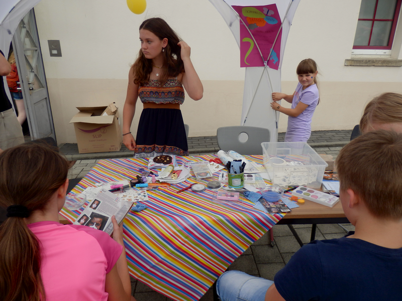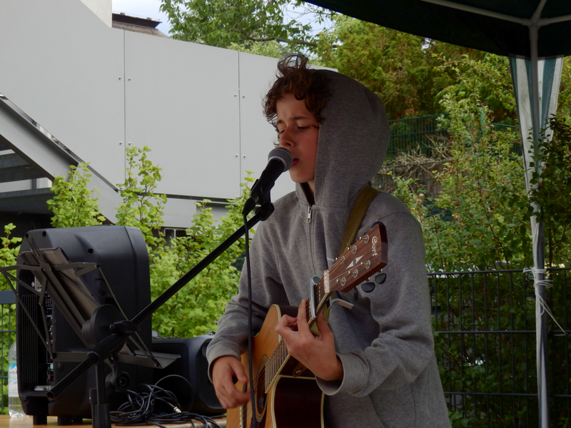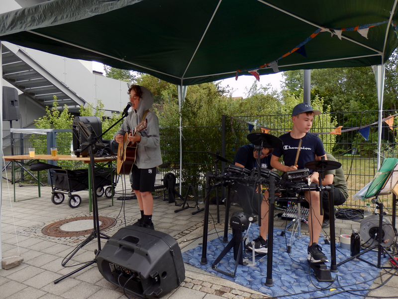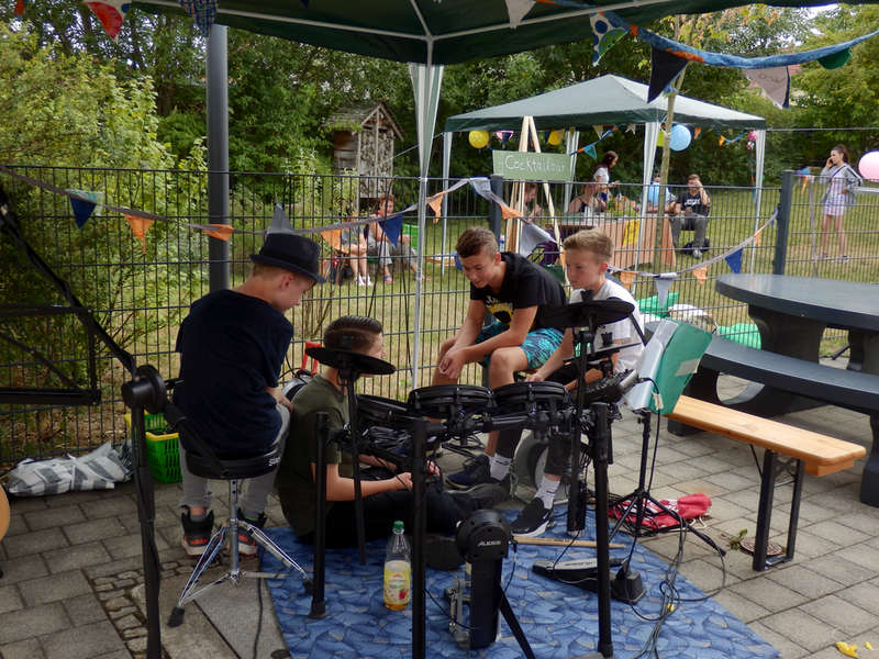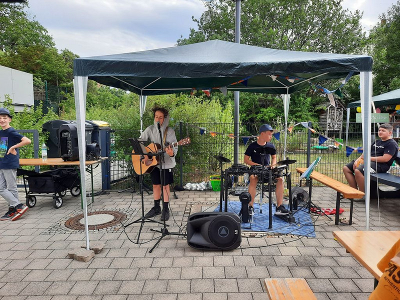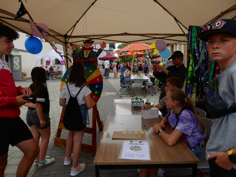 Eine Zwei-Mann-Band mit unserem Lenny aus der 7b am Schlagzeug und seinem Freund Thees an der Gitarre sorgte für gute Stimmung. Das Glücksrad drehte sich fast ununterbrochen. Im Sportteil flogen die Pfeile, Bälle. Im Korb der Feuerwehr konnte sich jeder, der es wollte und schwindelfrei war, einen Überblick über das Festgelände verschaffen.