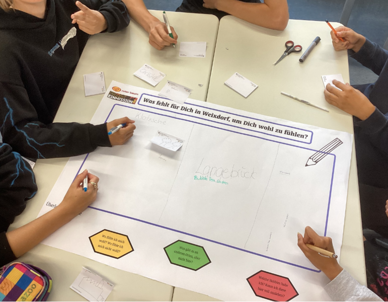 Wir fanden uns als nächstes in Gruppen zusammen und fingen an, unsere Verbesserungsvorschläge für Weixdorf und Umgebung zu malen und auf zu schreiben. Es war erstaunlich, zu sehen, wie kreativ und vielfältig die Vorschläge waren. Einige Schüler schlugen vor, einen „Bike Out Park” zu bauen, um Fahrradliebhabern einen Ort zum Austoben zu bieten. Andere schlugen Verbesserungen für das örtliche Waldbad vor, um es noch attraktiver zu machen. Es gab auch Ideen für einen neuen Skatepark und bunte Graffiti-Wände, um unser schönes Weixdorf zu verbessern.