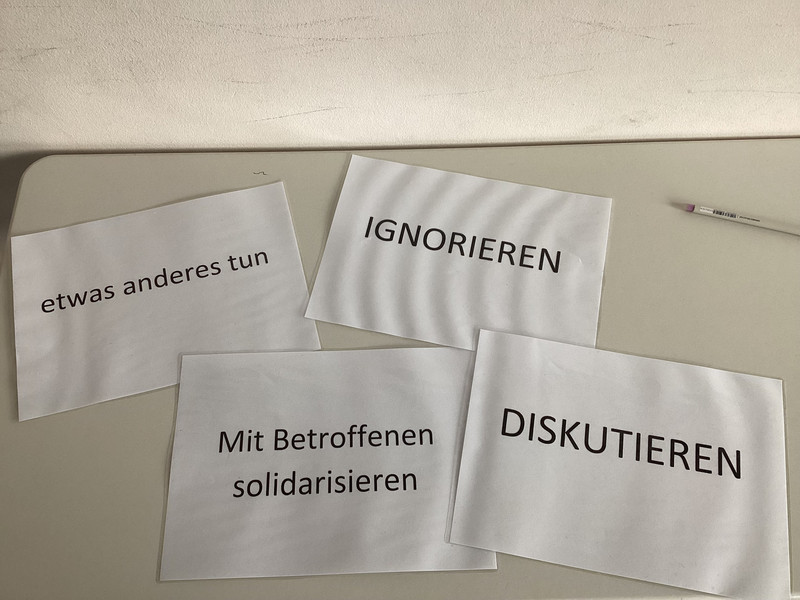 Als erstes haben wir mit einer Vorstellungsrunde gestartet, wo wir unsere Namen und Hobbys nennen sollten. Dann haben wir mit einem Erwärmungsspiel namens ,,Obstsalat“ begonnen. Anschließend haben wir erst richtig mit dem Thema gestartet. Wir haben verschiedene Situationen, in denen Menschen diskriminiert wurden, z.B.: im Klassenchat, vorgelesen bekommen und mussten uns dann zu den vier verschiedenen Gruppen: „ignorieren“, „diskutieren“, „mit Betroffenen solidarisieren“ oder „etwas anderes tun“, zuordnen, je nachdem was wir machen würden. Nach der Pause haben wir uns dann einen Film über rassistische Vorurteile angesehen. Am Ende haben wir, wie in einem Improtheater, verschiedenen Situationen im Leben, in denen Menschen vor allem rassistisch beleidigt wurden, nachgespielt. Wir haben uns dann in kleinen Gruppen verschiedene Lösungsansätze überlegt und vor der Klasse vorgespielt. Danach haben wir darüber diskutiert. Es gab viele interessante Lösungen.