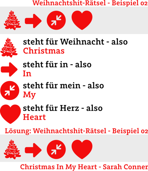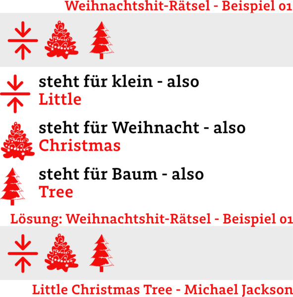 Dieses Jahr gibt es das große Weihnachtshit-Rätsel auf unserer Homepage. Zwölf englischsprachige Weihnachtshits sind mit Piktogrammen und Zeichen verschlüsselt. Für die Entschlüsselung braucht man neben dem Wissen um die Symbolik der Zeichen auch etwas Phantasie.