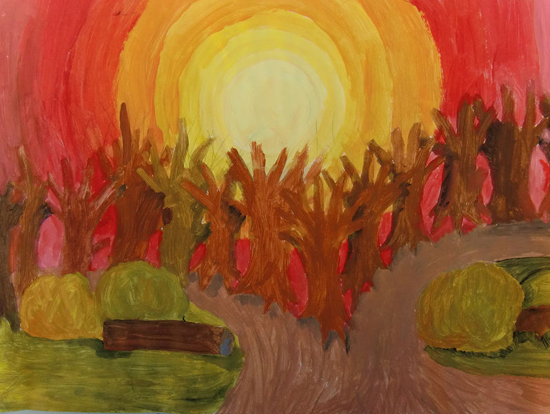 Die Klassen 5 und 5b lassen den goldenen Herbst leuchten. Mit nur zwei Farben, Rot und Gelb, mussten alle Herbsttöne selbst gemischt werden.