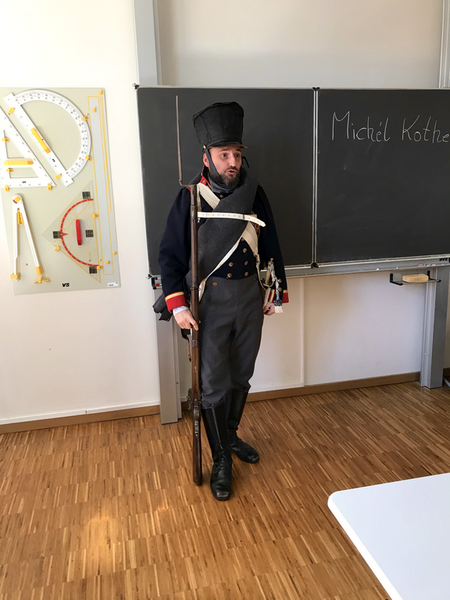 Am Montag, 09.05.2022 kam Michel Kothe in seiner Rolle als Preußischer Soldat des Jahres 1813 in unseren Geschichtsunterricht.