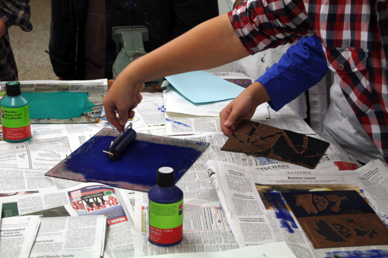Im Rahmen der ersten besonderen Woche führten die Klassen 7a und 7b eine Druckwerkstatt „Linolschnitt“ durch. Die Klasse 7b war am Donnerstag, 13.10.2011 fleißig und die 7a am Dienstag, 11.10.2011. Die im Unterricht vorbereiteten Druckplatten lieferten eine gute Grundlage.