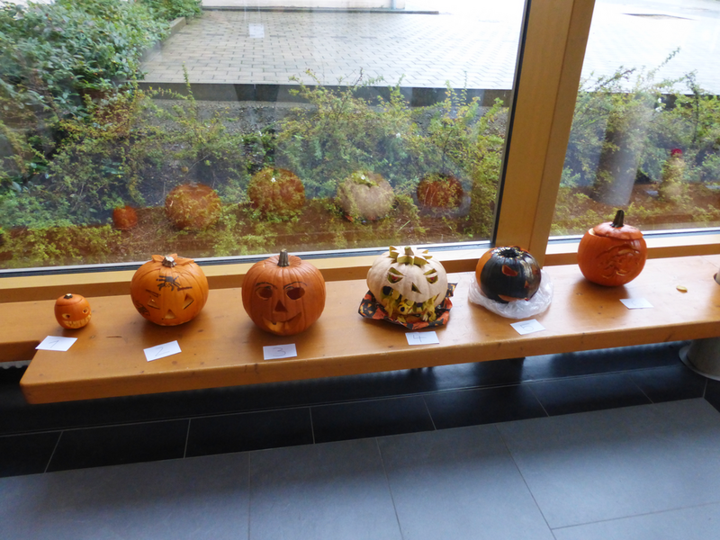 Alles wurde gruselig von den Lehrern geschmückt und gestaltet. Als die Schülerinnen und Schüler der 5. Klassen, verkleidet als Gespenster, Skelette und andere Grusel-Monster in die Schule kamen, konnten sie alles bewundern.