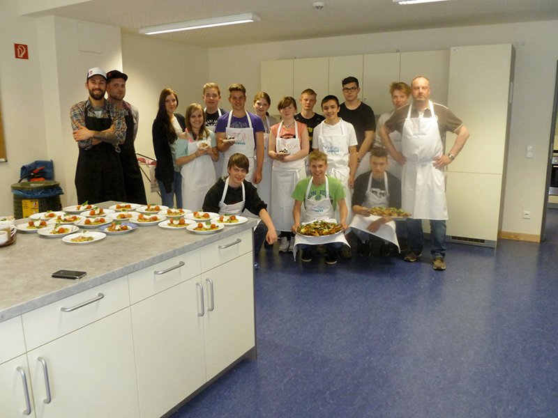 Rote Linsen, rote Beete, Fisch – Sachen, die nicht unbedingt jeder gern isst. Aber tolle Rezepte und die Kombination dieser Lebensmittel macht es, dass man am Ende sagt: „Das war lecker“, “ ich hätte nie gedacht, dass das schmeckt“. So ging es am 13.05. unseren Schülern, als sie gemeinsam mit Robert Müller und Constantin Müller (übrigens nicht miteinander verwandt) ein tolles 3- Gänge- Menü zubereiteten.