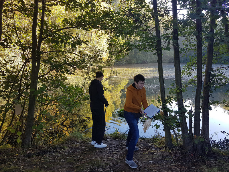 Im Rahmen des Gewässerpraktikums der 9. Klassen vom 5. bis zum 7.10. haben die Schüler bei herbstlich wechselhaftem Wetter am Regenrückhaltebecken nahe des Gewebegebiets Promigberg das Ökosystem Teich kennengelernt.