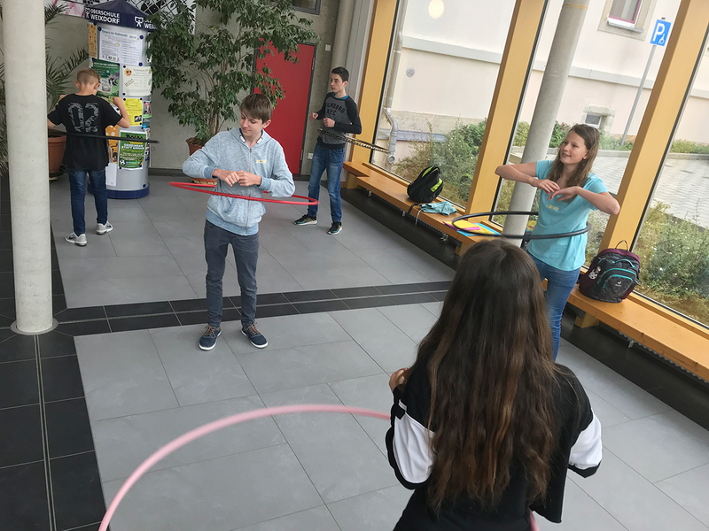 Zum ersten Hula - Hoop - Wettkampf am 22.06.2018 qualifizierten sich insgesamt 13 Teilnehmer aus den Klassenstufen 5 bis 9, welche im Vorausscheid mindestens 10 min den Reifen um die Hüfte schwingen konnten. Neun dieser Schüler stellten sich am Freitag ab 8:45 Uhr der Herausforderung.