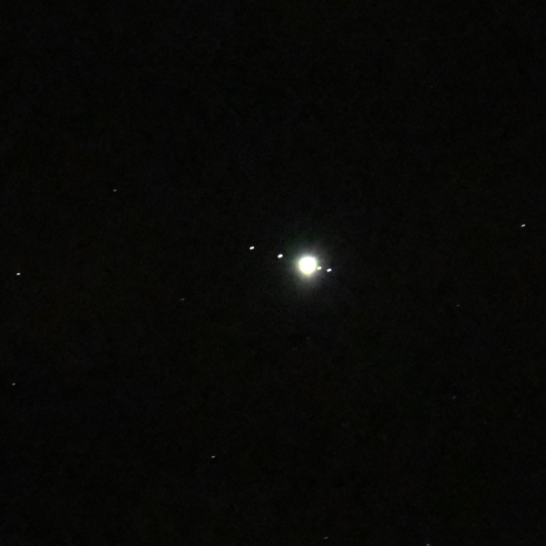 Zur Zeit ist abnehmender Mond (siehe Foto 1). Also sind in der Nacht ideale Beobachtungsbedingungen für Planeten und Sterne. Am frühen Nachthimmel steht zur Zeit der Planet Jupiter in voller Pracht. Mit einem einfachen Fernglas oder einer Kamera mit Teleobjektiv kann man schon die vier hellen Monde des Jupiter erkennen.