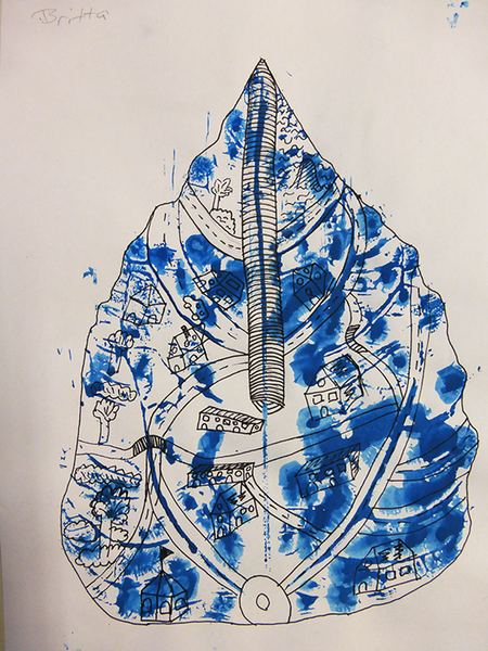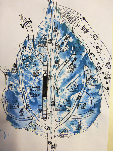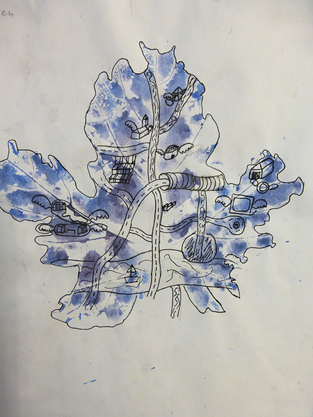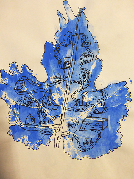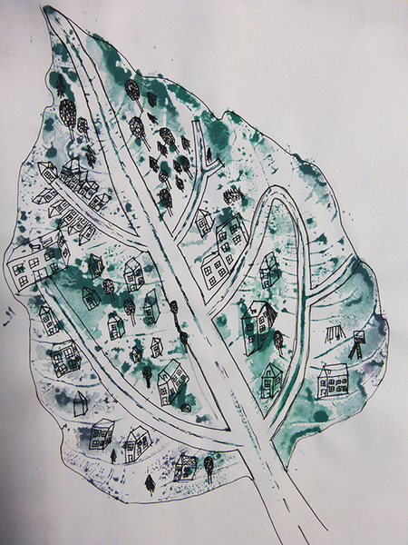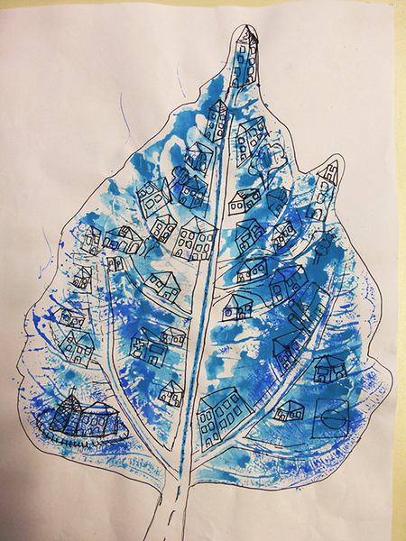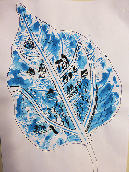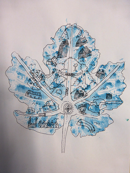Nachdem sich die Schüler der 6. Klasse im Bereich Grafik mit den Gestaltungsmitteln auseinandergesetzt hatten, sollte auch noch ein schönes grafisches Blatt entstehen. Und das im doppelten Sinne. Die Natur bot uns ihre Vorlage. Die Schüler färbten größere Blätter mit Temperafarbe ein und machten einen Abdruck. Schön traten die Blattadern hervor. Diese waren unser Straßennetz. Ohne perspektivische Vorkenntnisse entstanden entlang dieser „Straßen“ Häuser, Parkplätze, Grünanlagen oder einfach nur fantastische Objekte mit Fineliner. Die „Stadt im Blatt“ war fast fertig. Es fehlten noch ein paar Strukturen und kleine städtische Elemente, die dem Ganzen den Pfiff gaben. Sehen Sie selbst.
