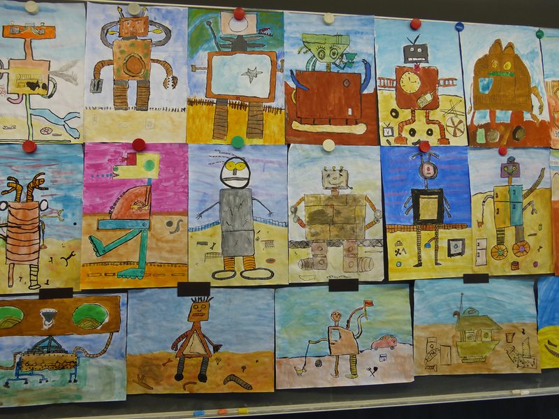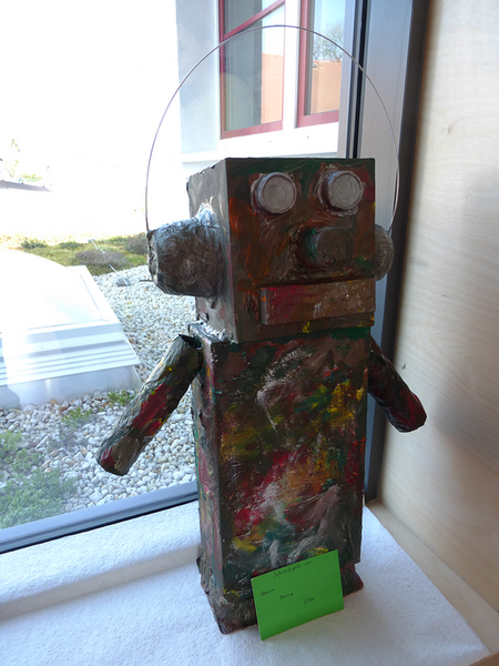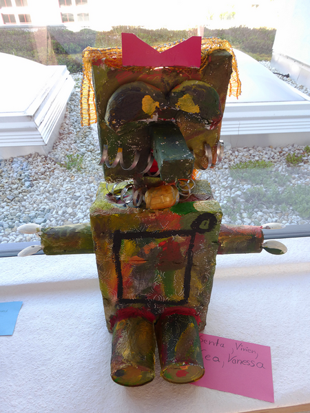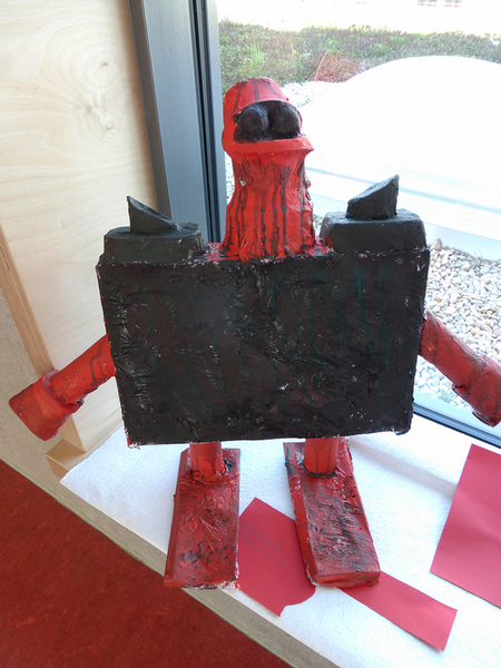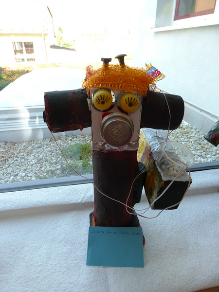 Nach einer kleinen Geschichte aus dem Kunstbuch entstanden zuerst auf dem Papier unsere eigenen, fantasievollen Schrottgötter, unsere Herrscher über den Schrottplatz. Wir gestalteten sie in rostigen Farben des Schrottes leicht aquarellhaft, um anschließend noch grafische Elemente mit Tusche hinzuzufügen. Nach einer kleinen Müllsammelaktion folgte nun eine Arbeit in Gruppen, bei der unser täglicher Abfall zu plastischen Schrottgöttern installiert wurde. Nicht immer war es einfach, die unterschiedlichen Materialien miteinander zu verbinden. Doch wir schafften es und verpassten im Anschluss unseren Figuren noch die nötige rostige Farbe.
