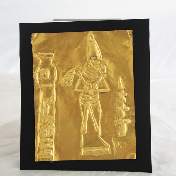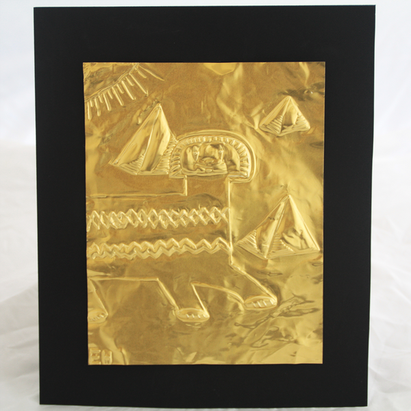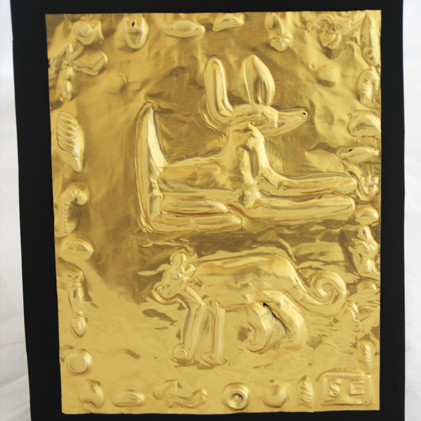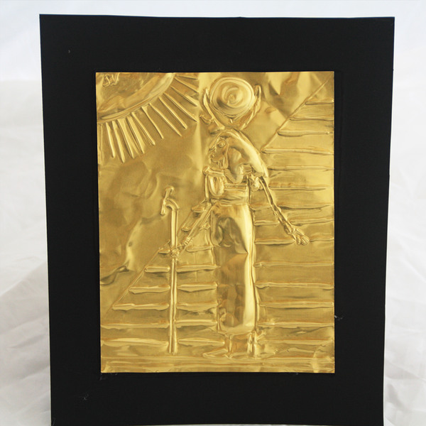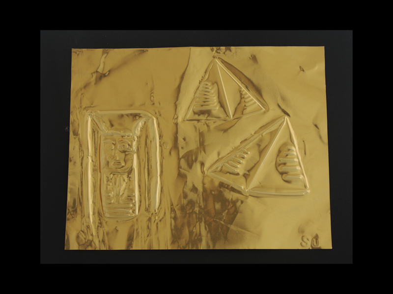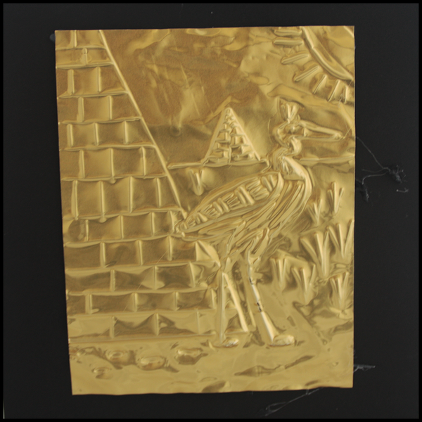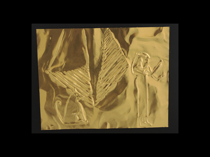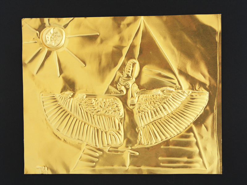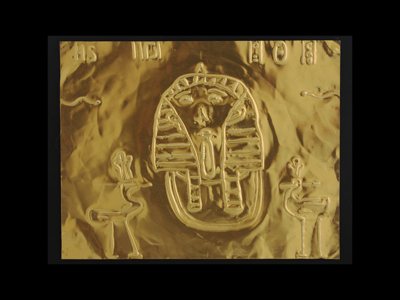 Die TUT-Ausstellung ist längst vorüber, aber bei uns kann man immer noch ägyptische Kunst bewundern. Die Schüler der Klassen 5b und 5c fertigten aus dünnen Metallplatten Reliefs nach ägyptischen Motiven. Die erste Schwierigkeit bestand darin, dass auf dem Metall keine Vorzeichnung möglich war und frei nach einer auf Papier gezeichneten Vorlage gearbeitet werden musste. Als Zweites mussten alle Formen von der Rückseite eingedrückt werden. Korrekturen von einmal verformter Metallfolie sind nicht möglich.