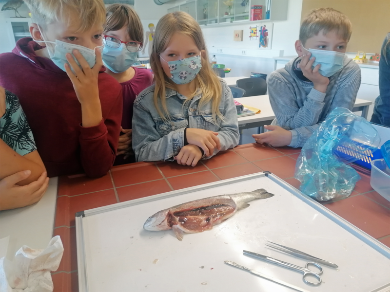 - „Wir haben in der Biologiestunde am 30.09.21 mit unserer Lehrerin eine Forelle ausgenommen. Am besten hat mir gefallen wie klein das Herz ist und die Schuppen, weil die so toll geglänzt haben“